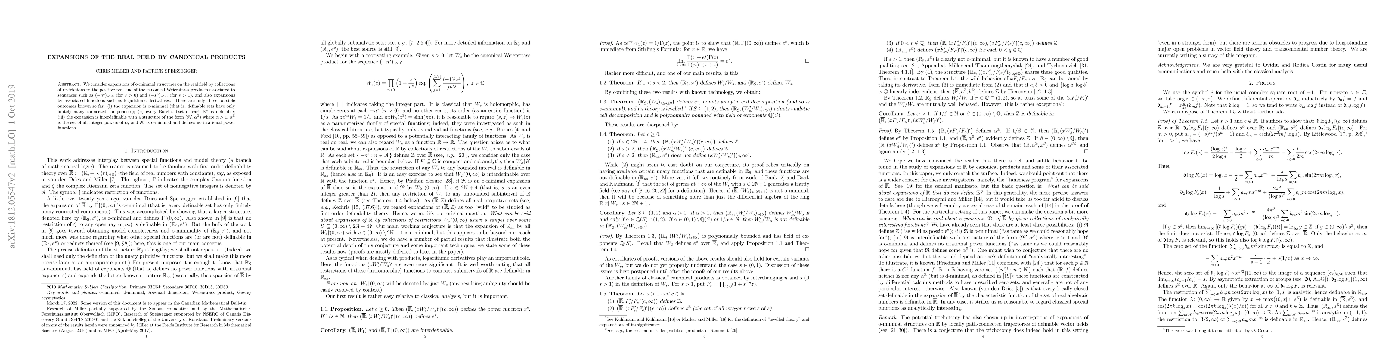 We consider expansions of o-minimal structures on the real field by collections of restrictions to the positive real line of the canonical Weierstrass products associated to sequences such as $(-n^s)_{n>0}$ (for $s>0$) and $(-s^n)_{n>0}$ (for $s>1$), and also expansions by associated functions such as logarithmic derivatives. There are only three possible outcomes known for the resulting structures: (i)~o-minimality; (ii)~d-minimality (but not o-minimality); (iii)~definability of $\mathbb{Z}$.