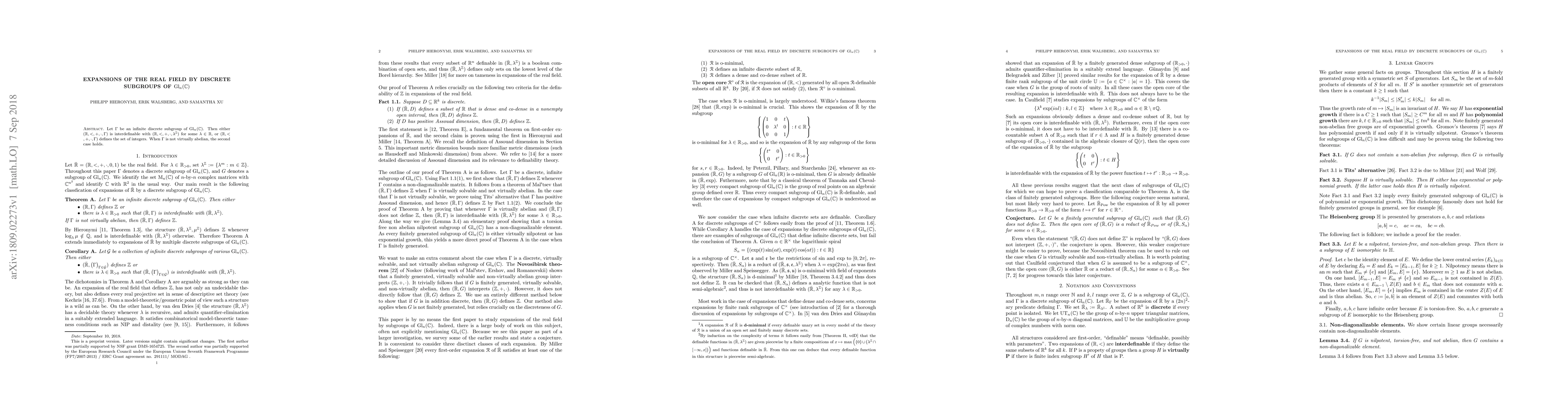 Let $\Gamma$ be an infinite discrete subgroup of Gl$_n(\mathbb{C})$. Then either $(\mathbb{R}, <, +, \cdot, \Gamma)$ is interdefinable with $(\mathbb{R}, <, +, \cdot, \lambda^\mathbb{Z})$ for some $\lambda \in \mathbb{R}$, or $(\mathbb{R}, < , +, \cdot, \Gamma)$ defines the set of integers. When $\Gamma$ is not virtually abelian, the second case holds.