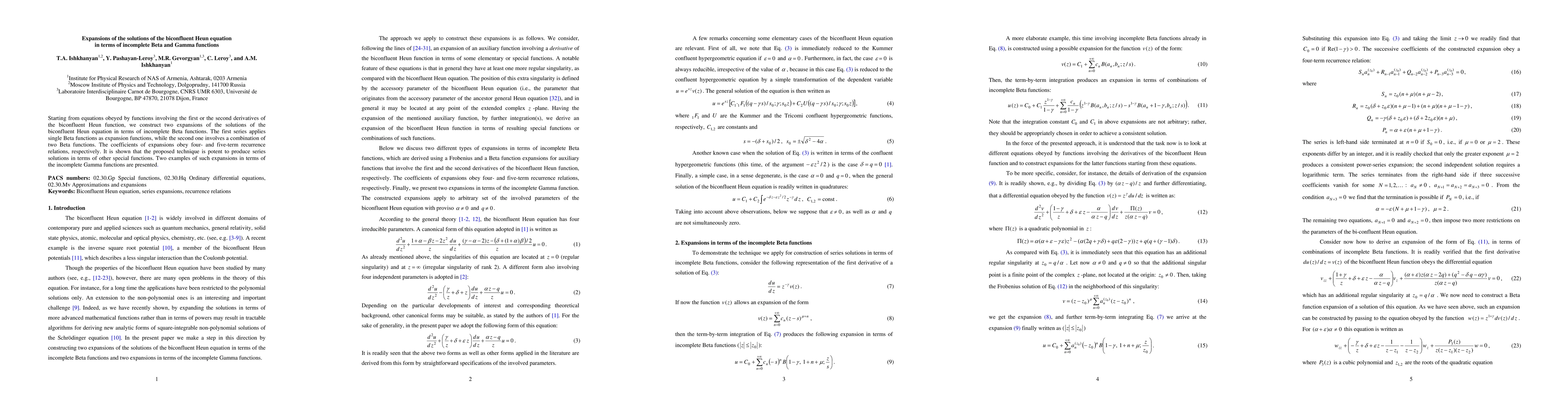 This paper constructs two expansions for solutions of the biconfluent Heun equation using incomplete Beta functions, with coefficients governed by recurrence relations. It also demonstrates the technique's applicability to incomplete Gamma functions through examples.