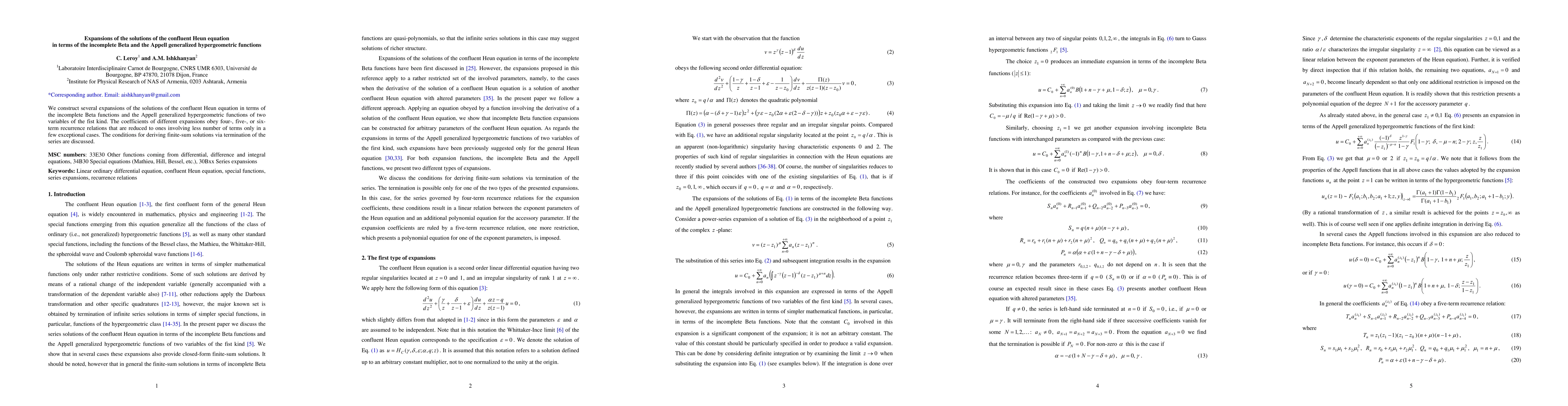 This paper constructs expansions for the solutions of the confluent Heun equation using incomplete Beta functions and Appell generalized hypergeometric functions. The coefficients follow recurrence relations, with some cases reduced to fewer terms, and conditions for finite-sum solutions via series termination are explored.