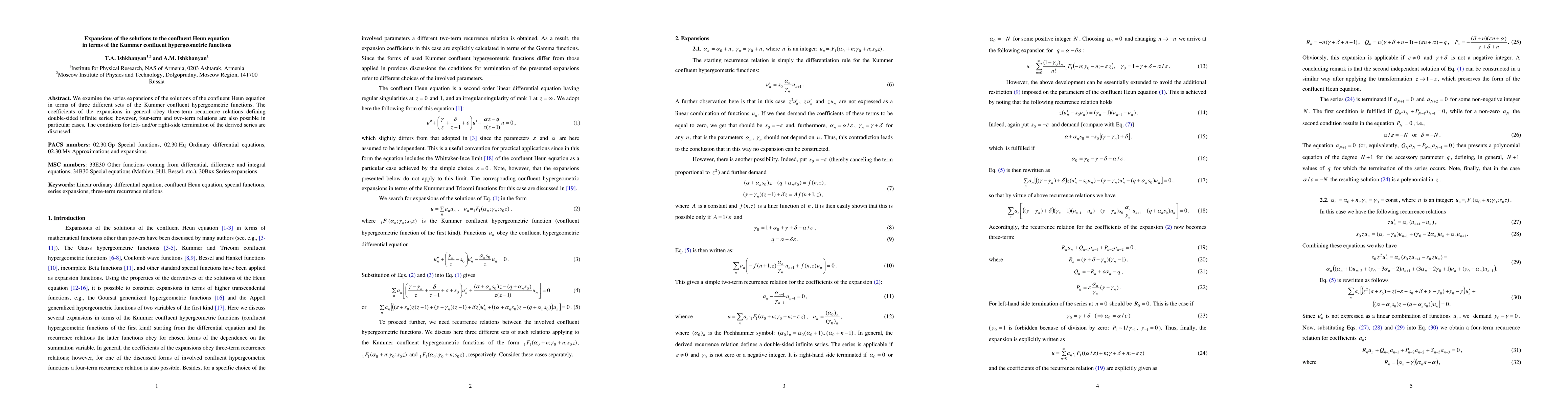 This paper explores series expansions for solutions of the confluent Heun equation using Kummer confluent hypergeometric functions. It reveals that while expansions generally follow three-term recurrence relations, specific cases allow for four-term and two-term relations, and conditions for series termination are analyzed.
