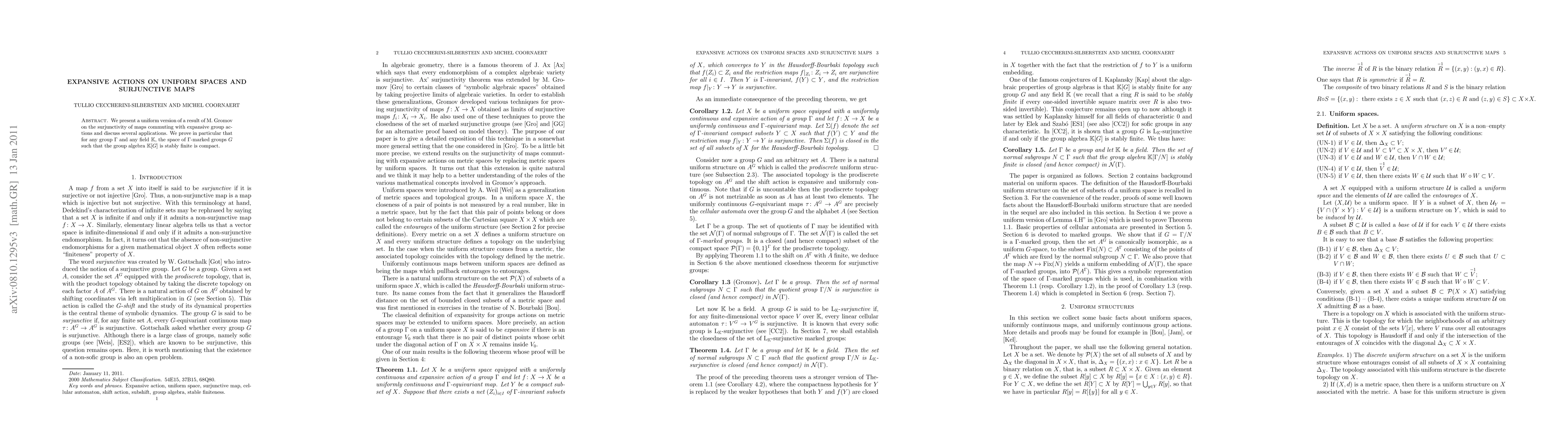 We present a uniform version of a result of M. Gromov on the surjunctivity of maps commuting with expansive group actions and discuss several applications. We prove in particular that for any group $\Gamma$ and any field $\K$, the space of $\Gamma$-marked groups $G$ such that the group algebra $\K[G]$ is stably finite is compact.