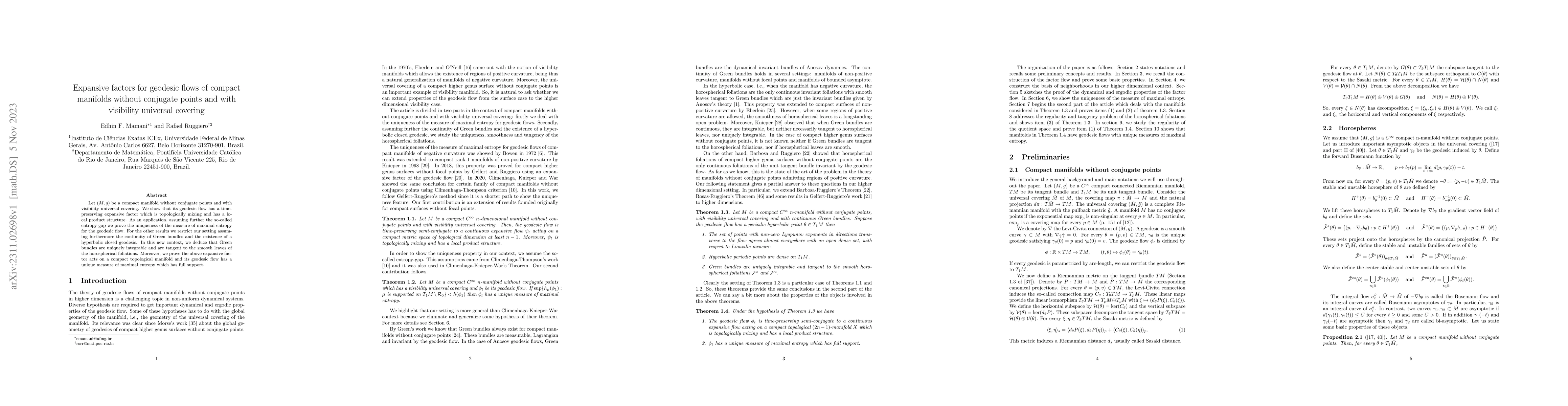 This paper demonstrates that the geodesic flow on a compact manifold without conjugate points and with a visibility universal covering exhibits a time-preserving expansive factor that is topologically mixing and locally product-structured. It also proves the uniqueness of the measure of maximal entropy under the additional entropy-gap condition.