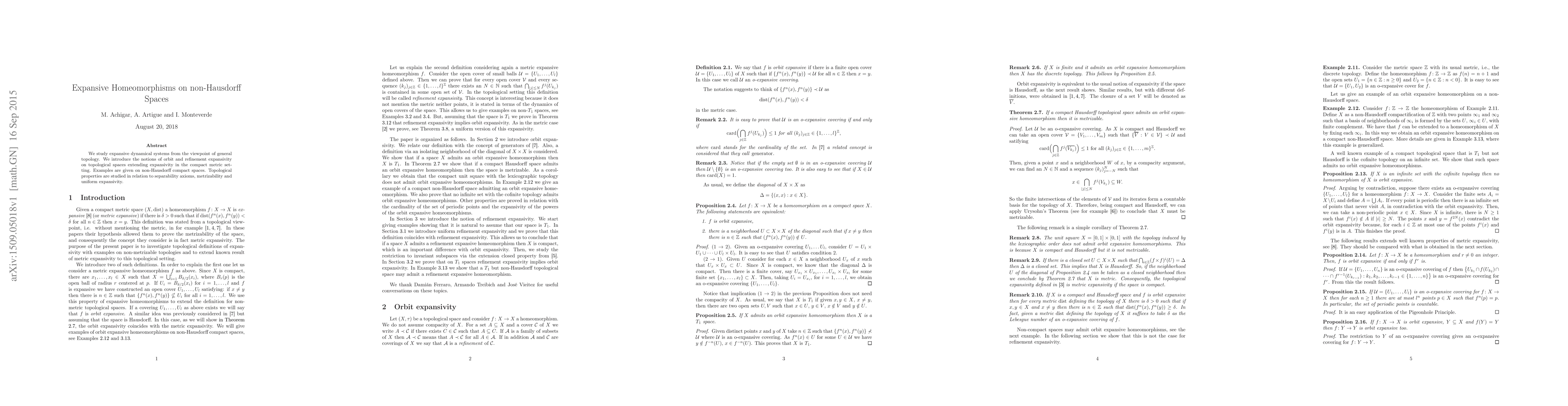 This paper explores expansive dynamical systems in the context of general topology, introducing orbit and refinement expansivity on non-Hausdorff spaces. It examines these concepts in relation to separability axioms, metrizability, and uniform expansivity, providing examples on non-Hausdorff compact spaces.
