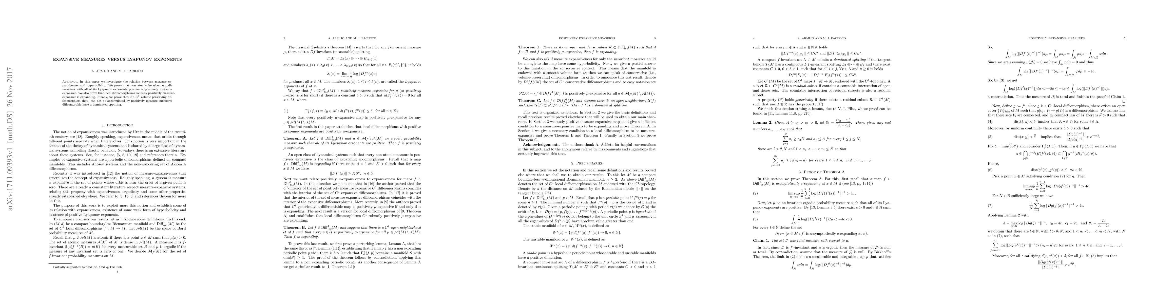 In this paper we investigate the relation between measure expansiveness and hyperbolicity. We prove that non atomic invariant ergodic measures with all of its Lyapunov exponents positive is positively measure-expansive. We also prove that local diffeomorphisms robustly positively measure-expansive is expanding. Finally, we prove that if a $C^1$ volume preserving diffeomorphism that. can not be accumulated by positively measure expansive diffeomorphis have a dominated sppliting.