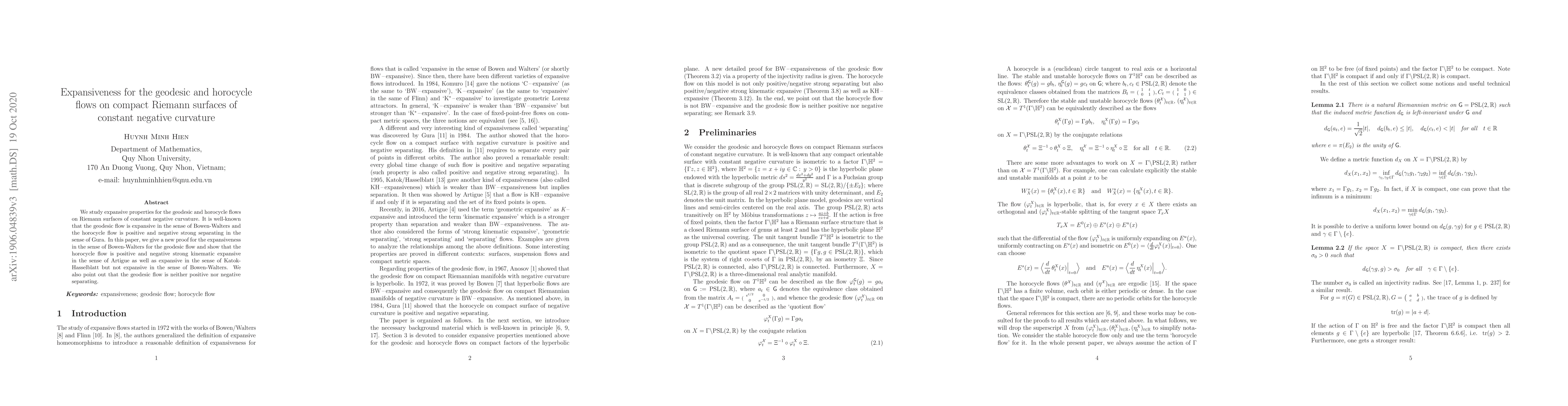 This paper investigates expansive properties for the geodesic and horocycle flows on compact Riemann surfaces with constant negative curvature. It provides a new proof of the geodesic flow's expansiveness and shows that the horocycle flow is expansive in the sense of Katok-Hasselblatt but not in the sense of Bowen-Walters.