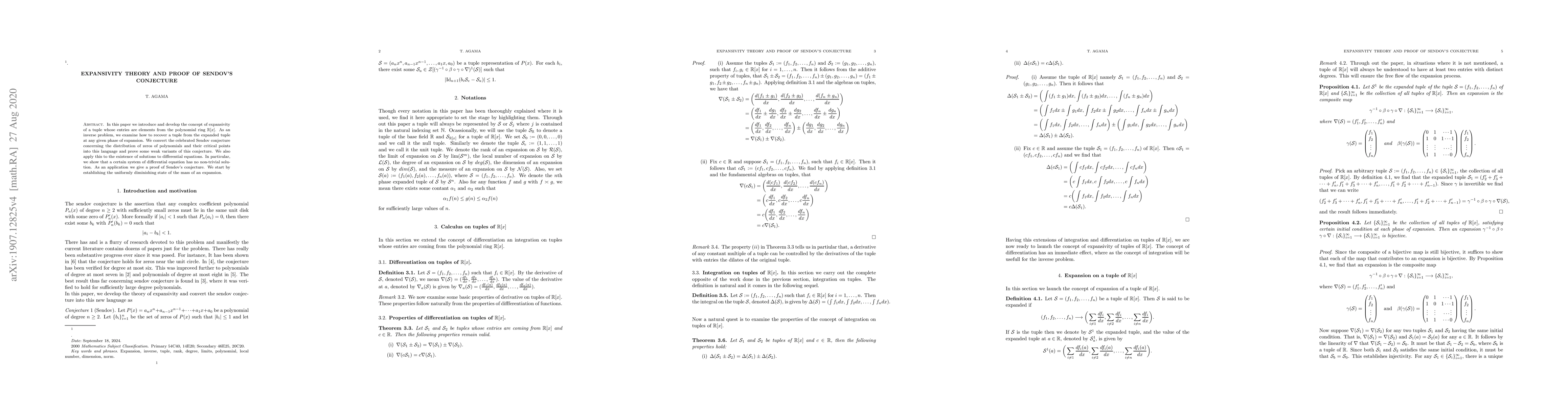 In this paper we introduce and develop the concept of expansivity of a tuple whose entries are elements from the polynomial ring $\mathbb{C}[x]$. As an inverse problem, we examine how to recover a tuple from the expanded tuple at any given phase of expansion. We convert the celebrated Sendov conjecture concerning the distribution of zeros of polynomials and their critical points into this language and prove some weak variants of this conjecture. We also apply this to the existence of solutions to differential equations. In particular, we show that a certain system of differential equation has no non-trivial solution. As an application we give a proof of Sendov's conjecture. We start by establishing the uniformly diminishing state of the mass of an expansion.