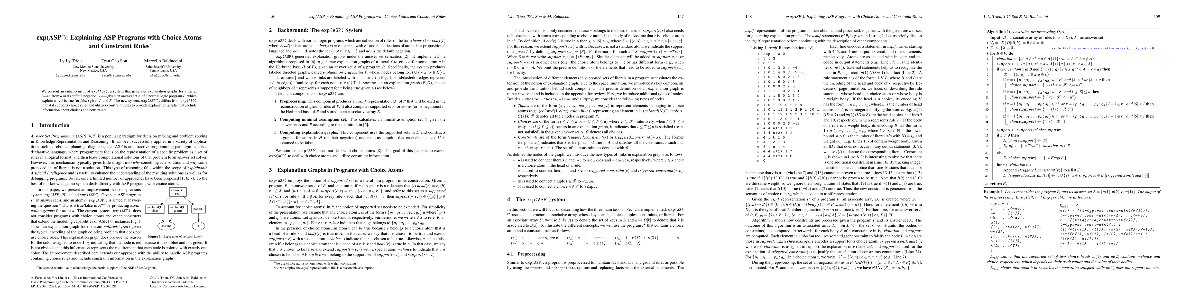 Summary: exp(ASPc) enhances exp(ASP) to generate explanation graphs for logic programs, now supporting choice rules and constraint rules to detail choices and constraints affecting atom truth values. This system provides more comprehensive explanations of program behavior.