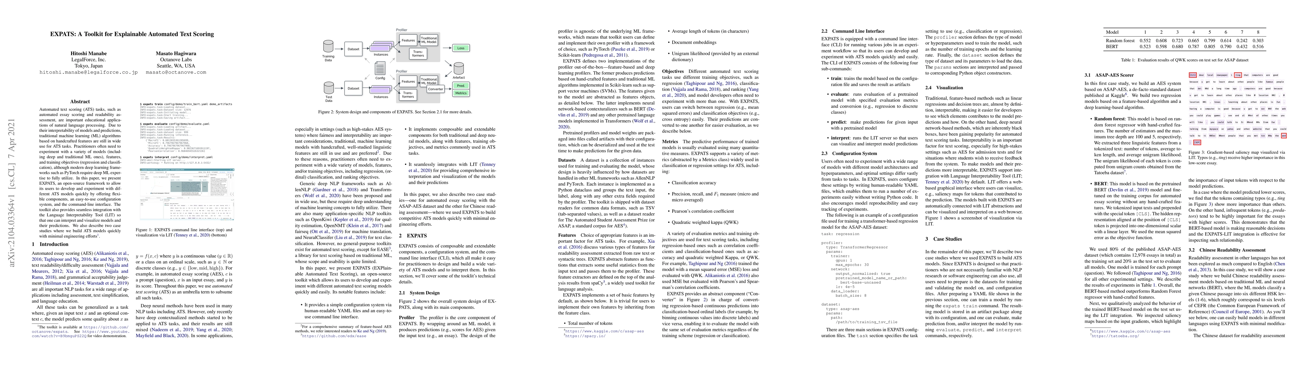 Automated text scoring (ATS) tasks, such as automated essay scoring and readability assessment, are important educational applications of natural language processing. Due to their interpretability of models and predictions, traditional machine learning (ML) algorithms based on handcrafted features are still in wide use for ATS tasks. Practitioners often need to experiment with a variety of models (including deep and traditional ML ones), features, and training objectives (regression and classification), although modern deep learning frameworks such as PyTorch require deep ML expertise to fully utilize. In this paper, we present EXPATS, an open-source framework to allow its users to develop and experiment with different ATS models quickly by offering flexible components, an easy-to-use configuration system, and the command-line interface. The toolkit also provides seamless integration with the Language Interpretability Tool (LIT) so that one can interpret and visualize models and their predictions. We also describe two case studies where we build ATS models quickly with minimal engineering efforts. The toolkit is available at \url{https://github.com/octanove/expats}.