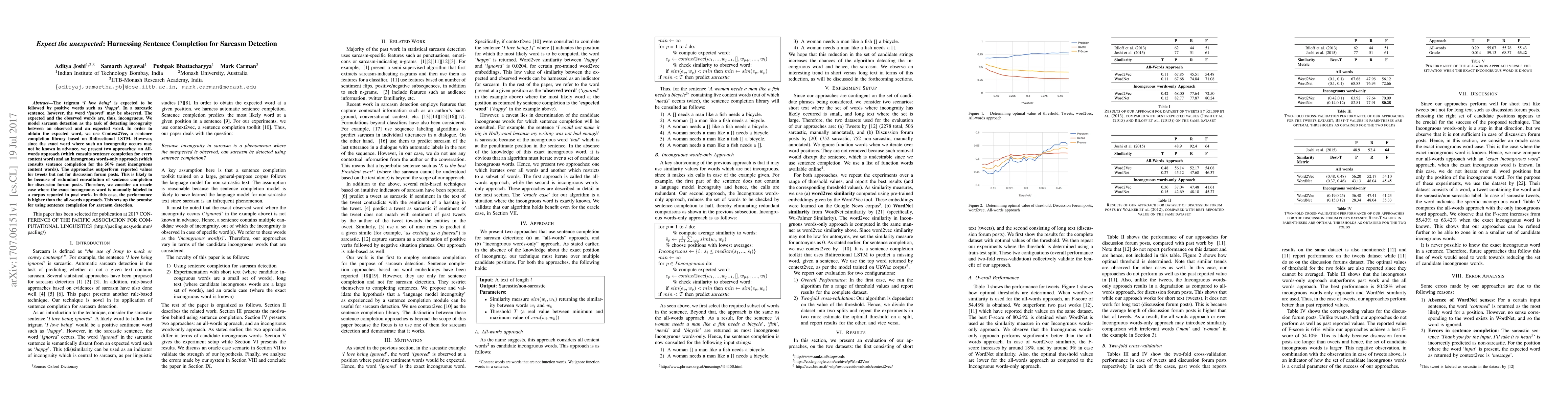 This paper explores sarcasm detection by identifying incongruity between expected and observed words using Context2Vec for sentence completion. Two approaches are proposed: an All-words approach and an Incongruous words-only approach, with the latter showing better performance when the exact incongruous word is known.