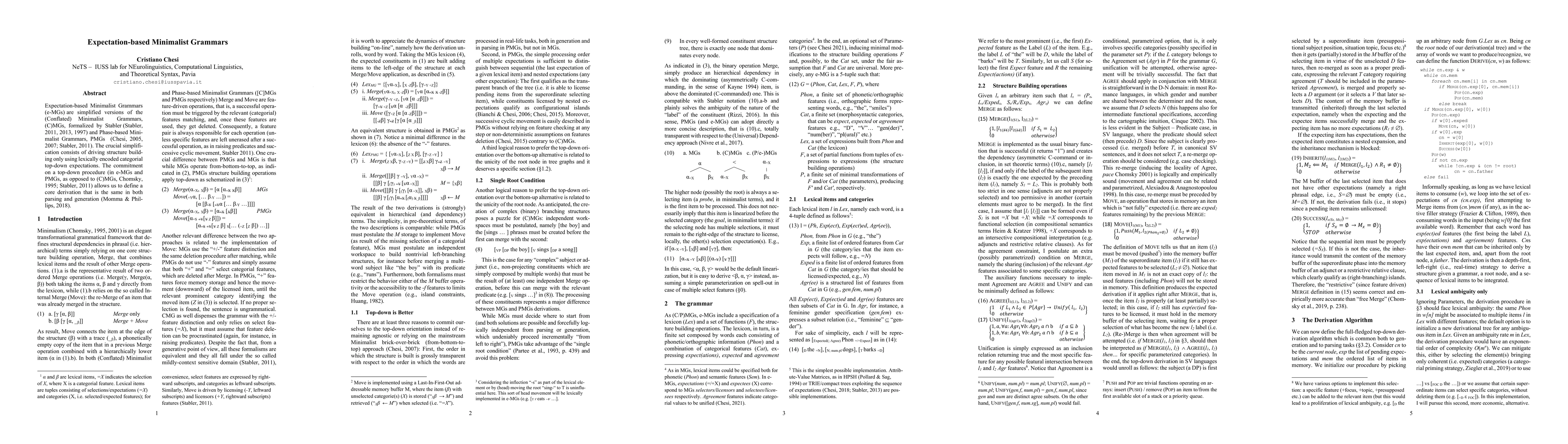 Expectation-based Minimalist Grammars (e-MGs) are simplified versions of the (Conflated) Minimalist Grammars, (C)MGs, formalized by Stabler (Stabler, 2011, 2013, 1997) and Phase-based Minimalist Grammars, PMGs (Chesi, 2005, 2007; Stabler, 2011). The crucial simplification consists of driving structure building only by relying on lexically encoded categorial top-down expectations. The commitment on a top-down derivation (as in e-MGs and PMGs, as opposed to (C)MGs, Chomsky, 1995; Stabler, 2011) allows us to define a core derivation that should be the same in both parsing and generation (Momma & Phillips, 2018).