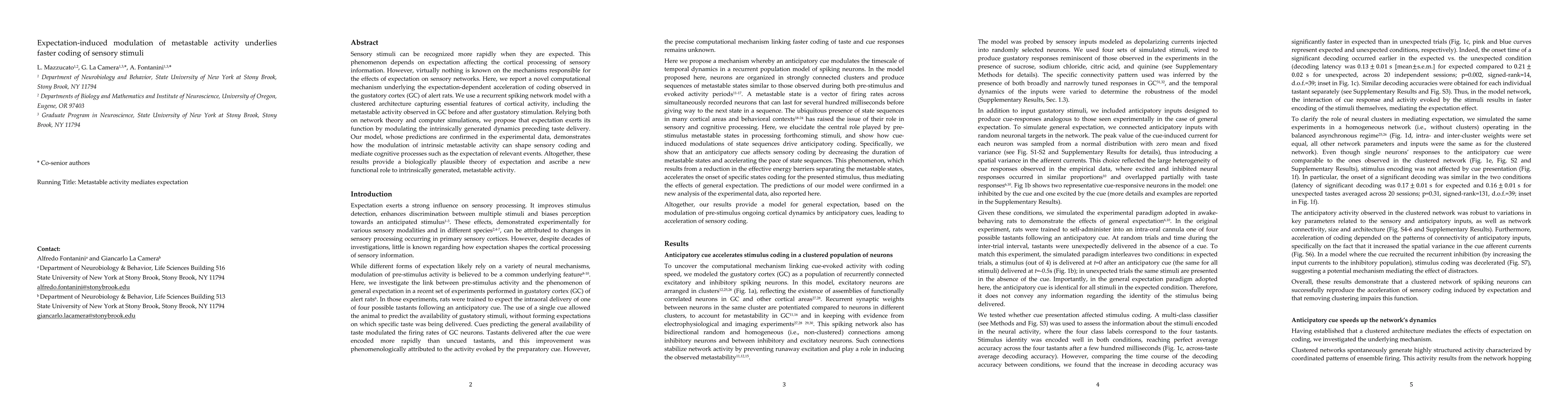 This research proposes a computational mechanism explaining how expectation accelerates sensory coding in the gustatory cortex, showing that expectation modulates intrinsic metastable activity to enhance sensory processing. The findings provide a biologically plausible theory of expectation and highlight the functional role of metastable activity in cognitive processes.