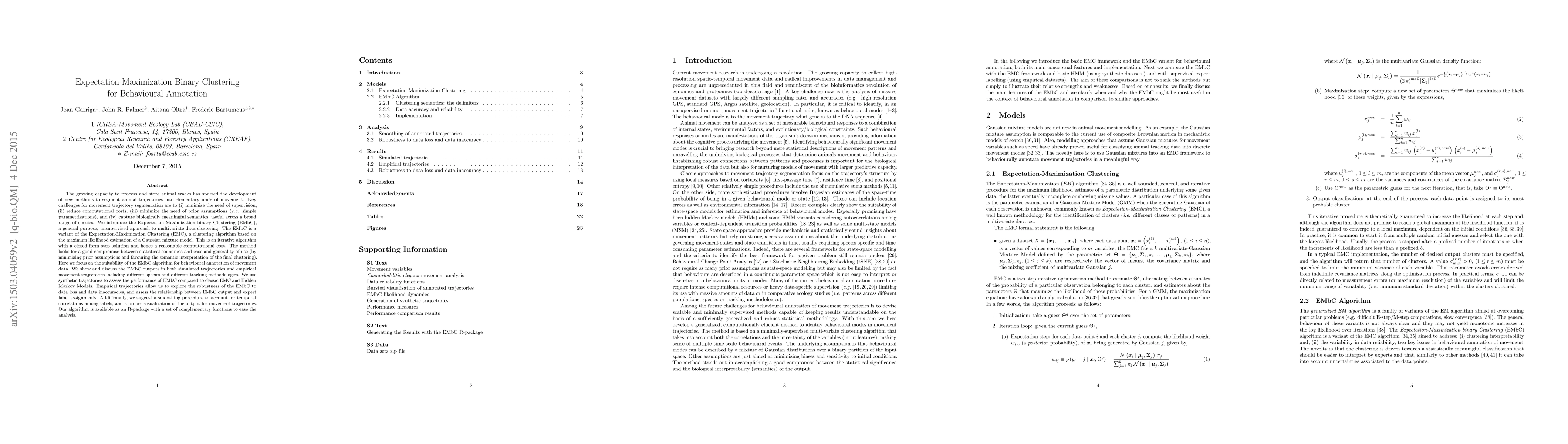 We present a variant of the well sounded Expectation-Maximization Clustering algorithm that is constrained to generate partitions of the input space into high and low values. The motivation of splitting input variables into high and low values is to favour the semantic interpretation of the final clustering. The Expectation-Maximization binary Clustering is specially useful when a bimodal conditional distribution of the variables is expected or at least when a binary discretization of the input space is deemed meaningful. Furthermore, the algorithm deals with the reliability of the input data such that the larger their uncertainty the less their role in the final clustering. We show here its suitability for behavioural annotation of movement trajectories. However, it can be considered as a general purpose algorithm for the clustering or segmentation of multivariate data or temporal series.