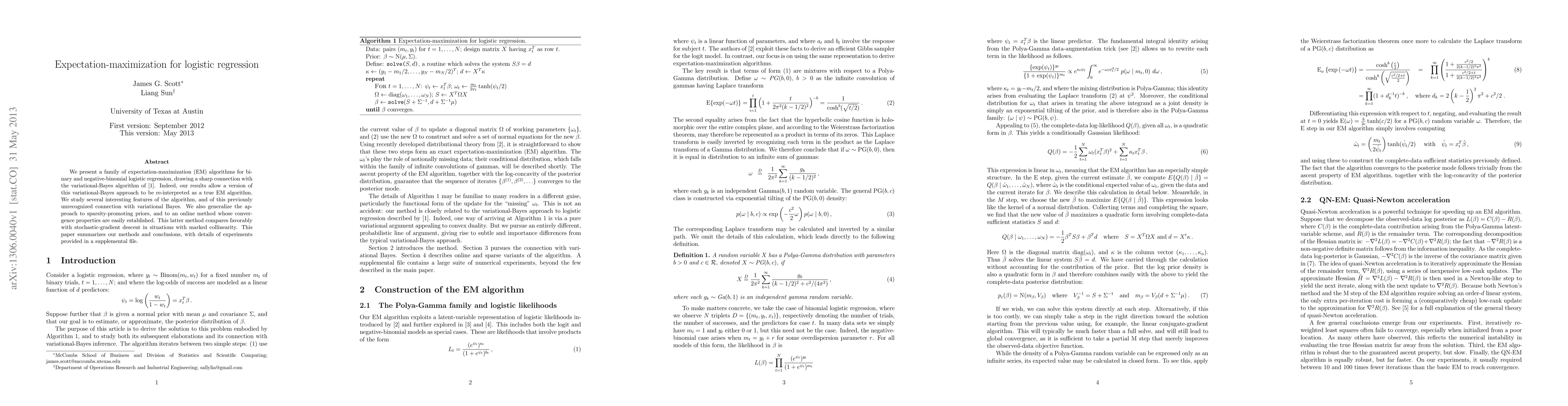 This paper introduces EM algorithms for binary and negative-binomial logistic regression, revealing a connection between these methods and the variational-Bayes approach. It also generalizes the approach to sparsity-promoting priors and proposes an online method that performs well in the presence of collinearity.