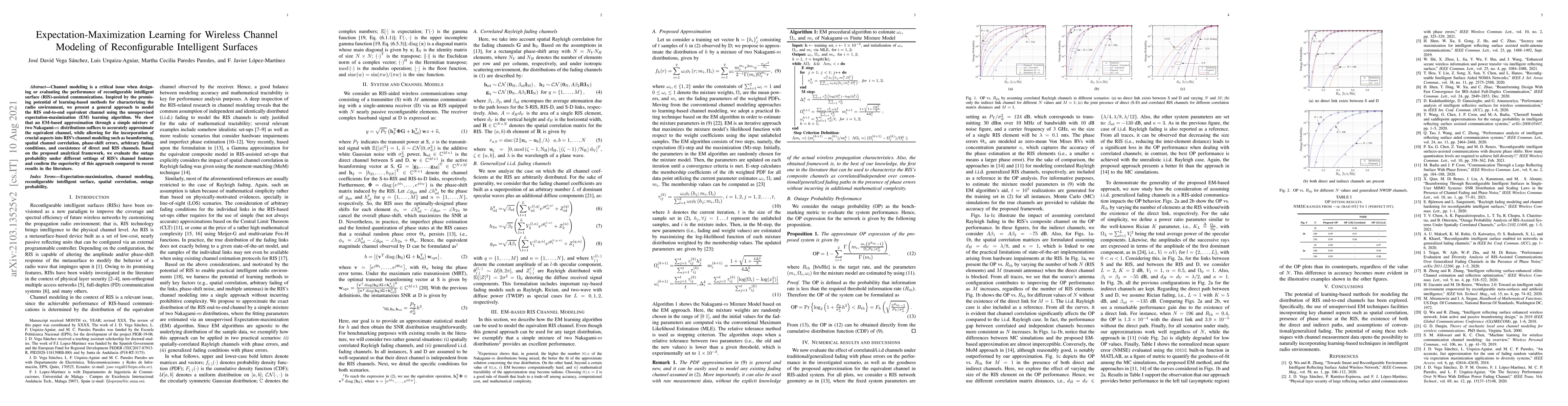 Channel modeling is a critical issue when designing or evaluating the performance of reconfigurable intelligent surface (RIS)-assisted communications. Inspired by the promising potential of learning-based methods for characterizing the radio environment, we present a general approach to model the RIS end-to-end equivalent channel using the unsupervised expectation-maximization (EM) learning algorithm. We show that an EM-based approximation through a simple mixture of two Nakagami-$m$ distributions suffices to accurately approximating the equivalent channel, while allowing for the incorporation of crucial aspects into RIS's channel modeling as spatial channel correlation, phase-shift errors, arbitrary fading conditions, and coexistence of direct and RIS channels. Based on the proposed analytical framework, we evaluate the outage probability under different settings of RIS's channel features and confirm the superiority of this approach compared to recent results in the literature.