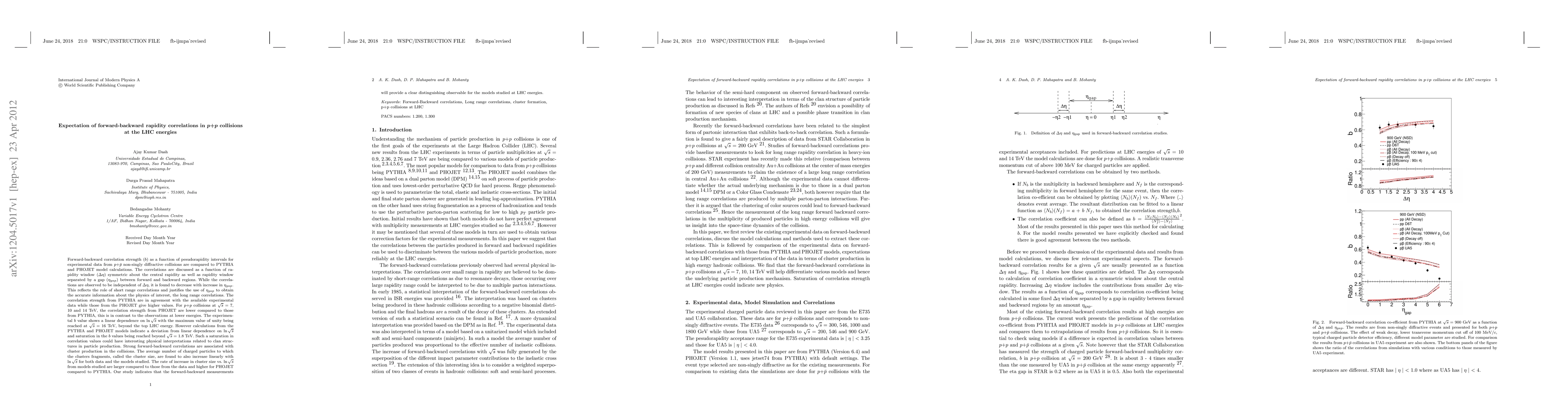 This paper investigates forward-backward rapidity correlations in $p+p$ collisions at LHC energies, comparing experimental data to PYTHIA and PHOJET models. The study finds that correlation strength decreases with increasing separation between forward and backward regions, indicating the importance of short-range correlations and the role of $\eta_{gap}$ in understanding long-range correlations.