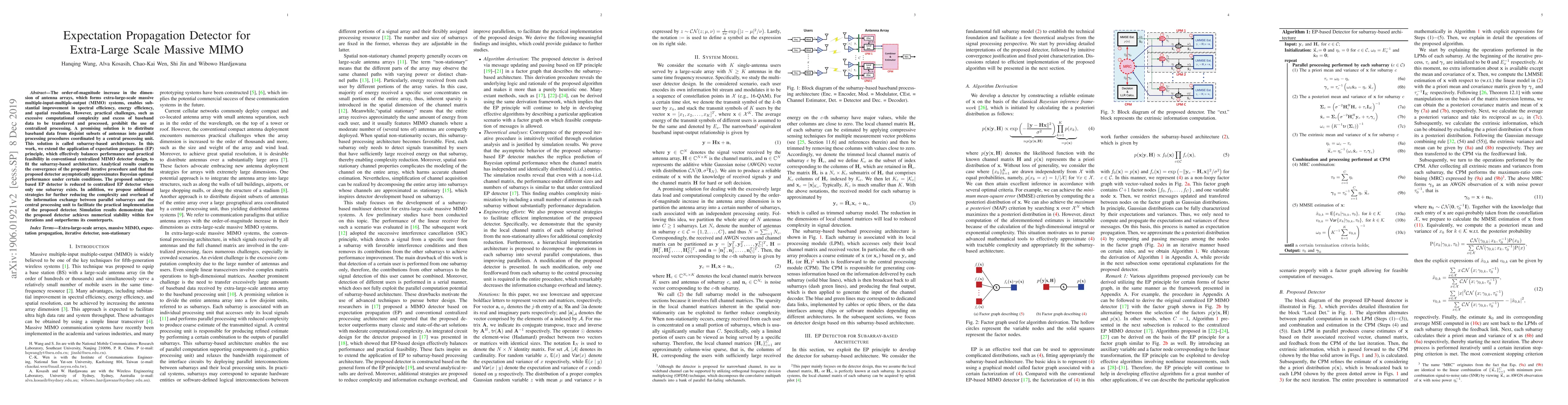 This paper proposes an Expectation Propagation (EP) detector for extra-large-scale massive MIMO systems, addressing the computational complexity and data transfer challenges of centralized processing. The subarray-based architecture distributes baseband data for parallel processing, achieving near-optimal performance with reduced complexity.
