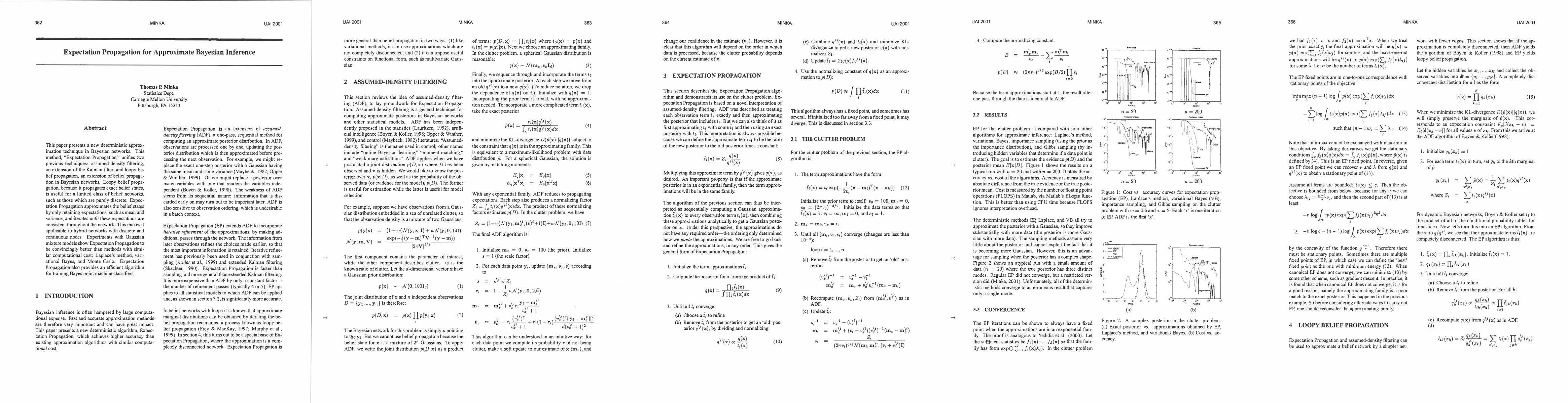 This paper introduces "Expectation Propagation," a new deterministic approximation technique for Bayesian networks that combines assumed-density filtering and loopy belief propagation. It is effective for hybrid networks and outperforms methods like Laplace's, variational Bayes, and Monte Carlo in Gaussian mixture models.