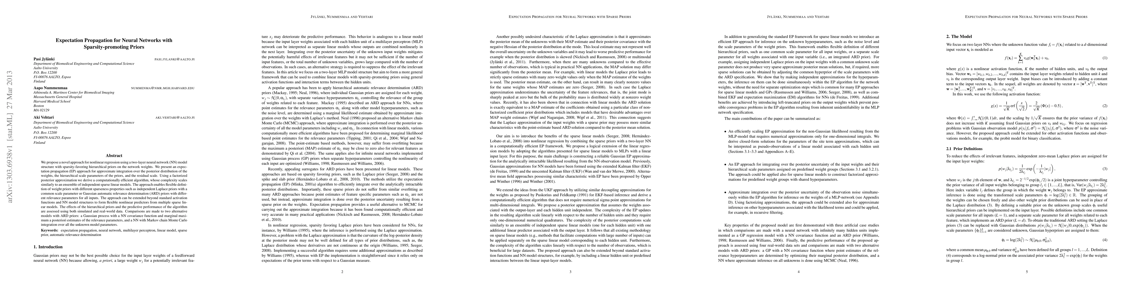 We propose a novel approach for nonlinear regression using a two-layer neural network (NN) model structure with sparsity-favoring hierarchical priors on the network weights. We present an expectation propagation (EP) approach for approximate integration over the posterior distribution of the weights, the hierarchical scale parameters of the priors, and the residual scale. Using a factorized posterior approximation we derive a computationally efficient algorithm, whose complexity scales similarly to an ensemble of independent sparse linear models. The approach enables flexible definition of weight priors with different sparseness properties such as independent Laplace priors with a common scale parameter or Gaussian automatic relevance determination (ARD) priors with different relevance parameters for all inputs. The approach can be extended beyond standard activation functions and NN model structures to form flexible nonlinear predictors from multiple sparse linear models. The effects of the hierarchical priors and the predictive performance of the algorithm are assessed using both simulated and real-world data. Comparisons are made to two alternative models with ARD priors: a Gaussian process with a NN covariance function and marginal maximum a posteriori estimates of the relevance parameters, and a NN with Markov chain Monte Carlo integration over all the unknown model parameters.