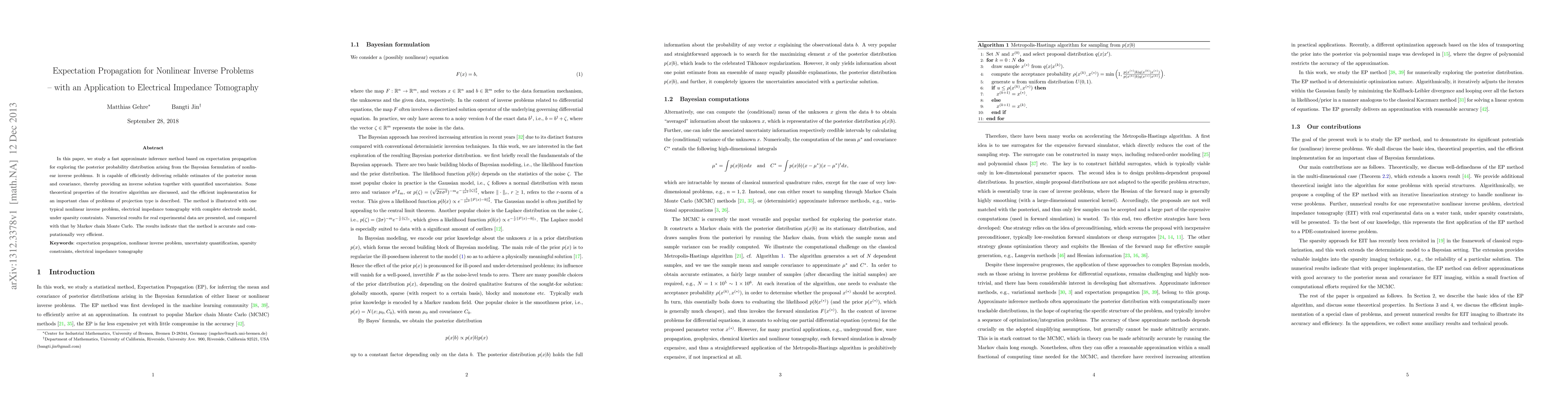 This paper proposes an efficient expectation propagation method for solving nonlinear inverse problems, specifically applied to electrical impedance tomography. The method provides accurate posterior mean and covariance estimates, demonstrating computational efficiency and accuracy through real data comparisons with Markov chain Monte Carlo.