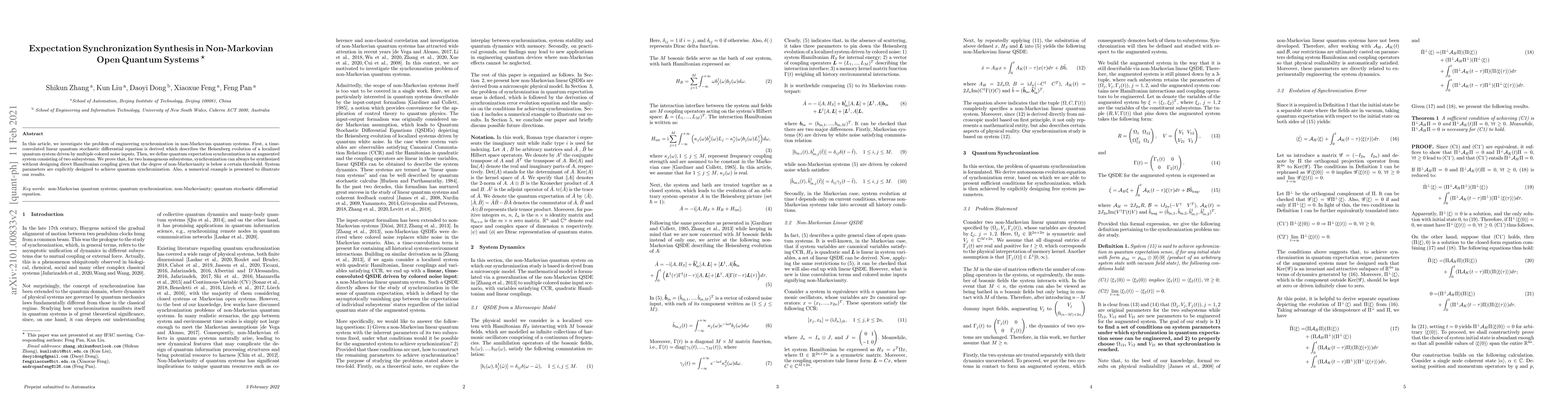 This paper explores the synchronization of quantum expectations in non-Markovian open quantum systems using a time-convoluted linear quantum stochastic differential equation. It demonstrates that synchronization can be achieved without direct Hamiltonian coupling if the non-Markovianity level is below a specific threshold, with explicit parameter design for synchronization.