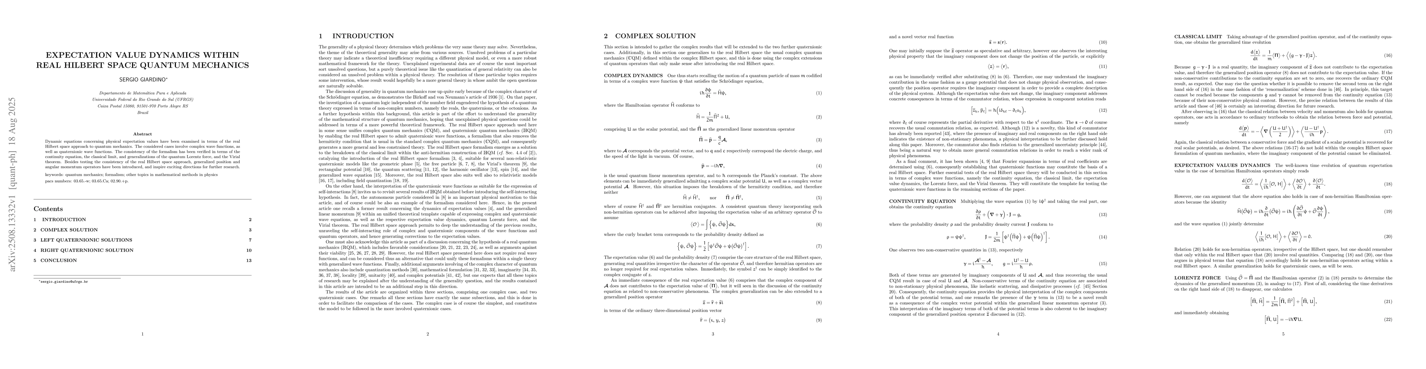 Dynamic equations concerning physical expectation values have been examined in terms of the real Hilbert space approach to quantum mechanics. The considered cases involve complex wave functions, as well as quaternionic wave functions. The consistency of the formalism has been verified in terms of the continuity equation, the classical limit, and generalizations of the quantum Lorentz force, and the Virial theorem. Besides testing the consistency of the real Hilbert space approach, generalized position and angular momentum operators have been introduced, and inspire exciting directions for further research.
