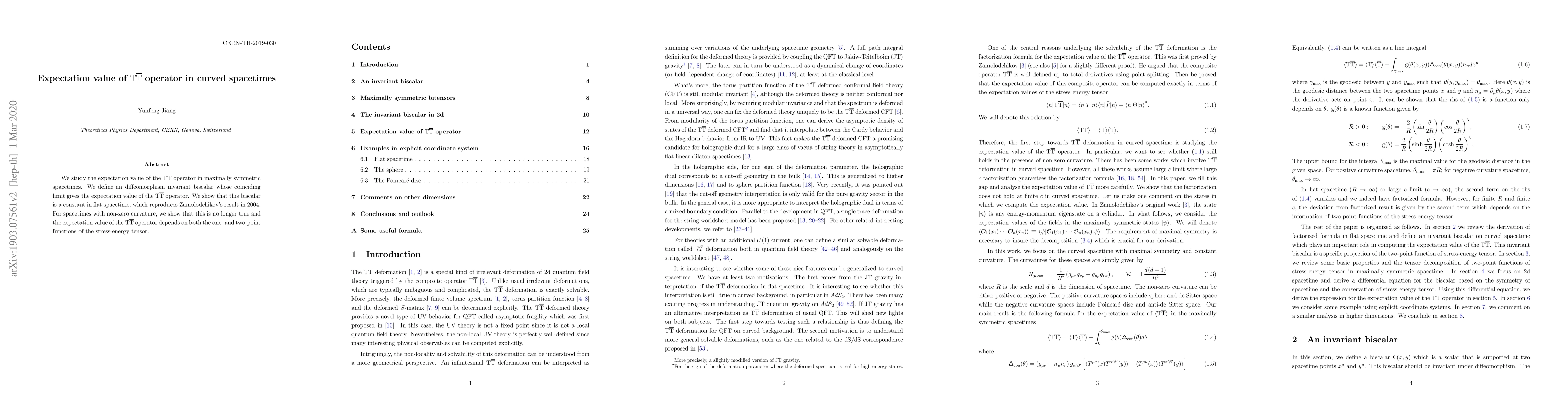 Research shows that the expectation value of the $ ext{T}ar{ ext{T}}$ operator changes in curved spacetimes, depending on both one-point and two-point functions of stress-energy tensor.