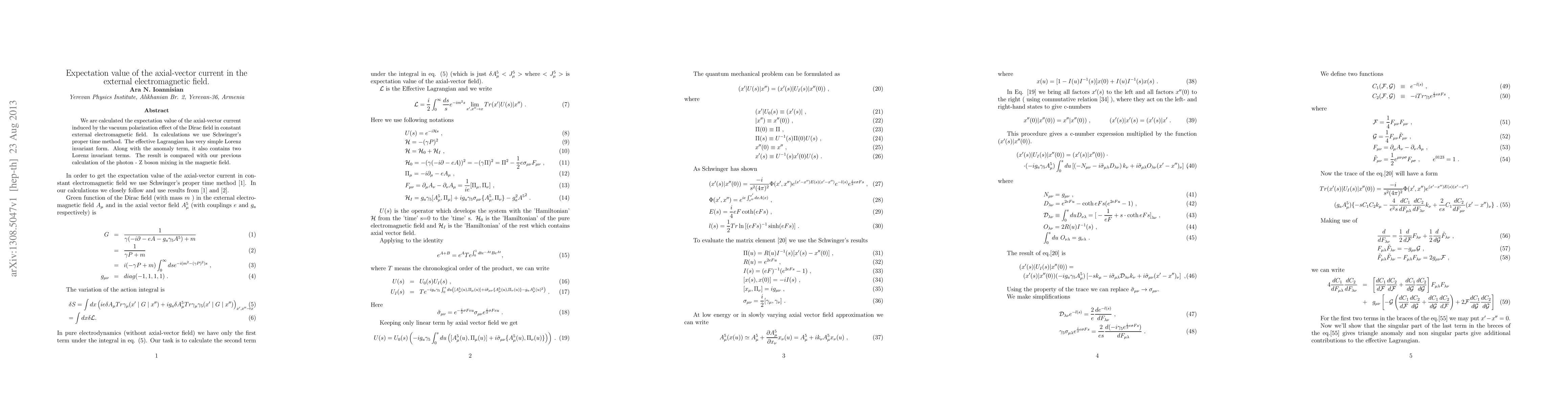 We are calculated the expectation value of the axial-vector current induced by the vacuum polarization effect of the Dirac field in constant external electromagnetic field. In calculations we use Schwinger's proper time method. The effective Lagrangian has very simple Lorenz invariant form. Along with the anomaly term, it also contains two Lorenz invariant terms. The result is compared with our previous calculation of the photon - Z boson mixing in the magnetic field.