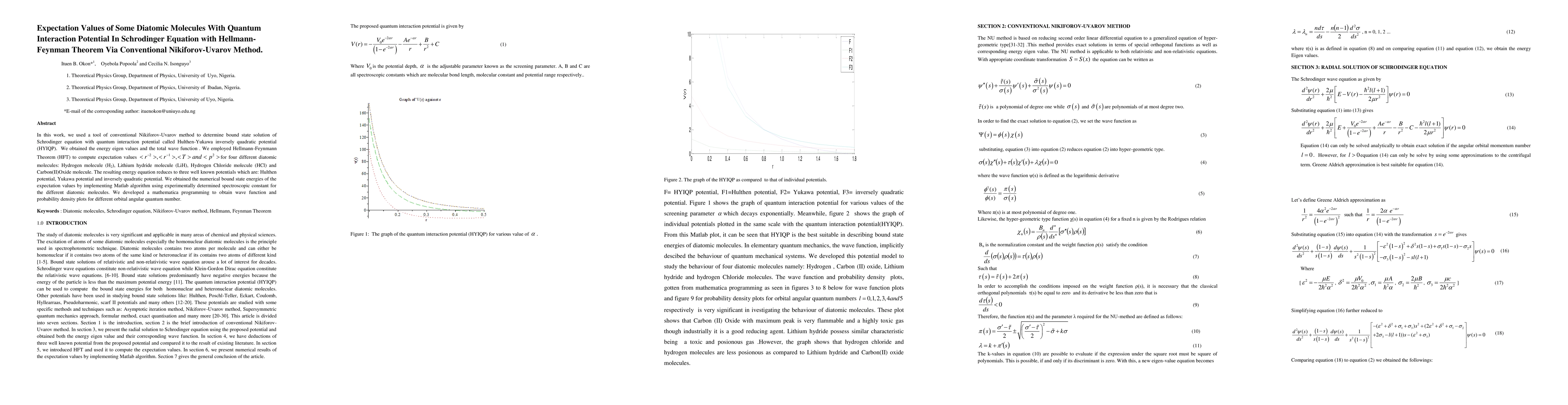 In this work, we used a tool of conventional Nikiforov-Uvarov method to determine bound state solution of Schrodinger equation with quantum interaction potential called Hulthen-Yukawa inversely quadratic potential (HYIQP). We obtained the energy eigen values and the total wave function . We employed Hellmann-Feynmann Theorem (HFT) to compute expectation values for four different diatomic molecules: Hydrogen molecule (H2), Lithium hydride molecule (LiH), Hydrogen Chloride molecule (HCl) and Carbon(II)Oxide molecule. The resulting energy equation reduces to three well known potentials which are: Hulthen potential, Yukawa potential and inversely quadratic potential. We obtained the numerical bound state energies of the expectation values by implementing Matlab algorithm using experimentally determined spectroscopic constant for the different diatomic molecules. We developed a mathematica programming to obtain wave function and probability density plots for different orbital angular quantum number.