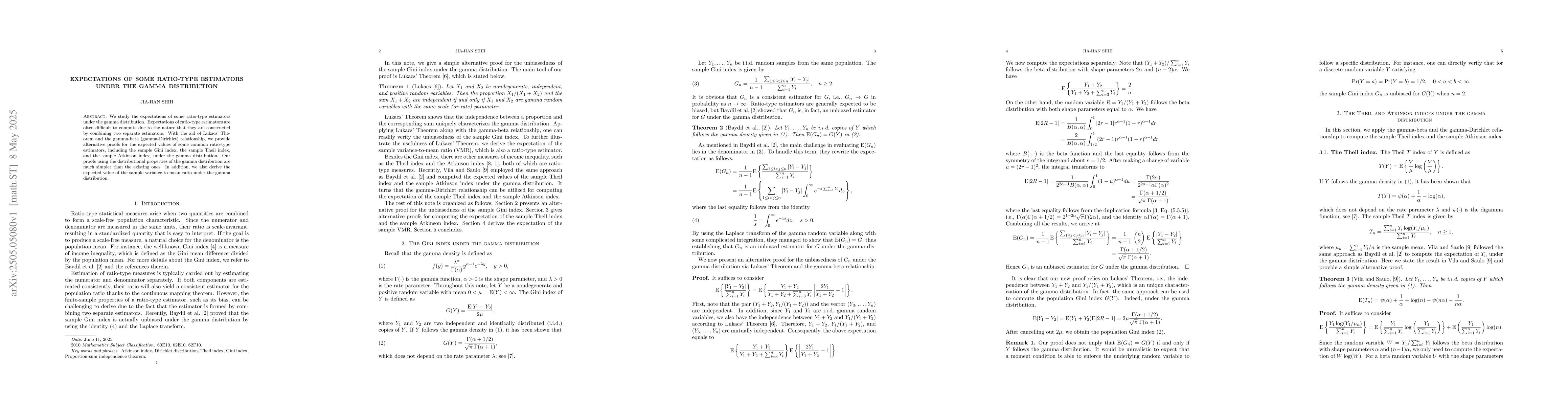 This paper simplifies the calculation of expected values for ratio-type estimators under the gamma distribution, using Lukacs' Theorem and the gamma-beta relationship to provide alternative proofs for common indices like Gini and Theil index.