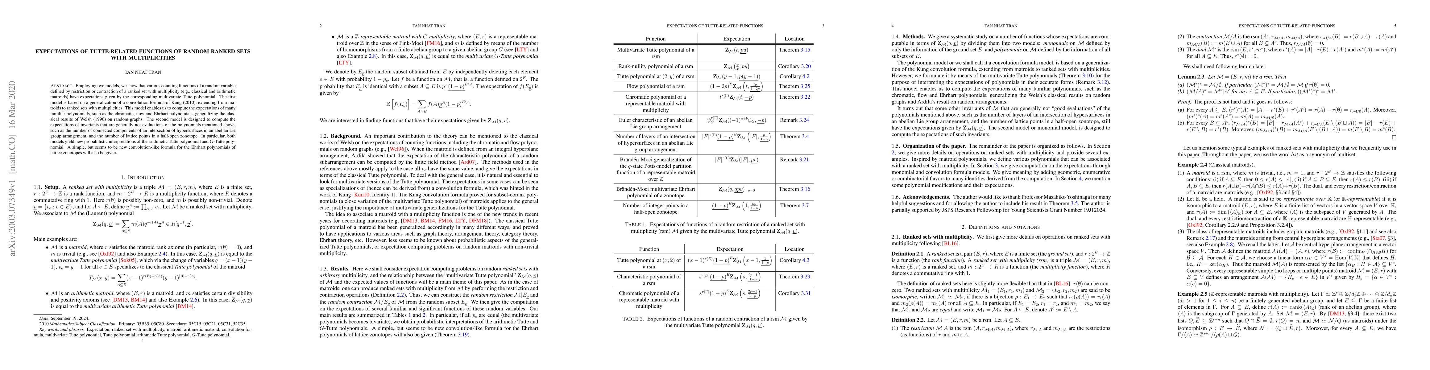 Employing two models, we show that various counting functions of a random variable defined by restriction or contraction of a ranked set with multiplicity (e.g., classical and arithmetic matroids) have expectations given by the corresponding multivariate Tutte polynomial. The first model is based on a generalization of a convolution formula of Kung (2010), extending from matroids to ranked sets with multiplicities. This model enables us to compute the expectations of many familiar polynomials, such as the chromatic, flow and Ehrhart polynomials, generalizing the classical results of Welsh (1996) on random graphs. The second model is designed to compute the expectations of invariants that are generally not evaluations of the polynomials mentioned above, such as the number of connected components of an intersection of hypersurfaces in an abelian Lie group arrangement, and the number of lattice points in a half-open zonotope. In particular, both models yield new probabilistic interpretations of the arithmetic Tutte polynomial and $G$-Tutte polynomial. A simple, but seems to be new convolution-like formula for the Ehrhart polynomials of lattice zonotopes will also be given.