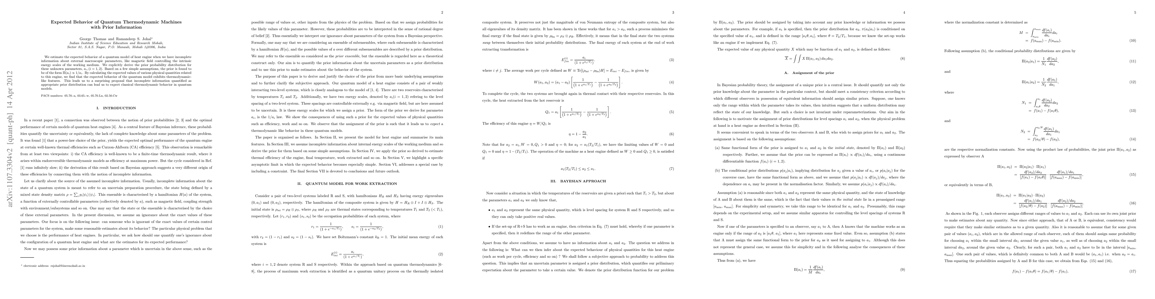 We estimate the expected behavior of a quantum model of heat engine when we have incomplete information about external macroscopic parameters, like magnetic field controlling the intrinsic energy scales of the working medium. We explicitly derive the prior probability distribution for these unknown parameters, $a_i, (i=1,2)$. Based on a few simple assumptions, the prior is found to be of the form $\Pi(a_i) \propto 1/a_i$. By calculating the expected values of various physical quantities related to this engine, we find that the expected behavior of the quantum model exhibits thermodynamic-like features. This leads us to a surprising proposal that incomplete information quantified as appropriate prior distribution can lead us to expect classical thermodynamic behavior in quantum models.