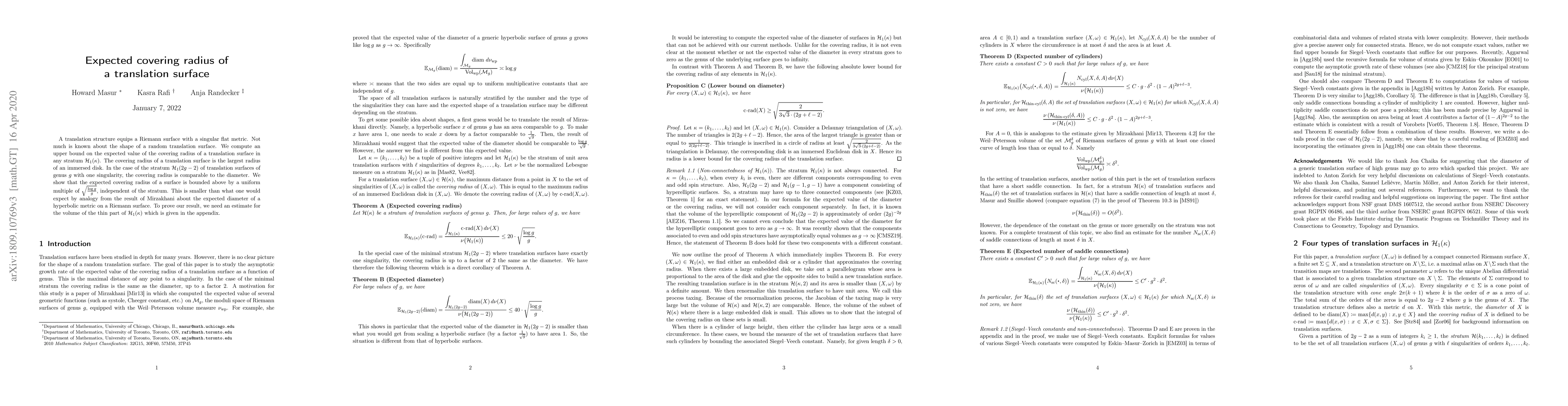 This paper computes an upper bound on the expected covering radius of a translation surface in any stratum H_1(kappa), showing it is bounded above by a uniform multiple of ((log g)/g)^(1/2), independent of the stratum, which is smaller than the expected diameter analogy. The result relies on an estimate for the volume of the thin part of H_1(kappa).