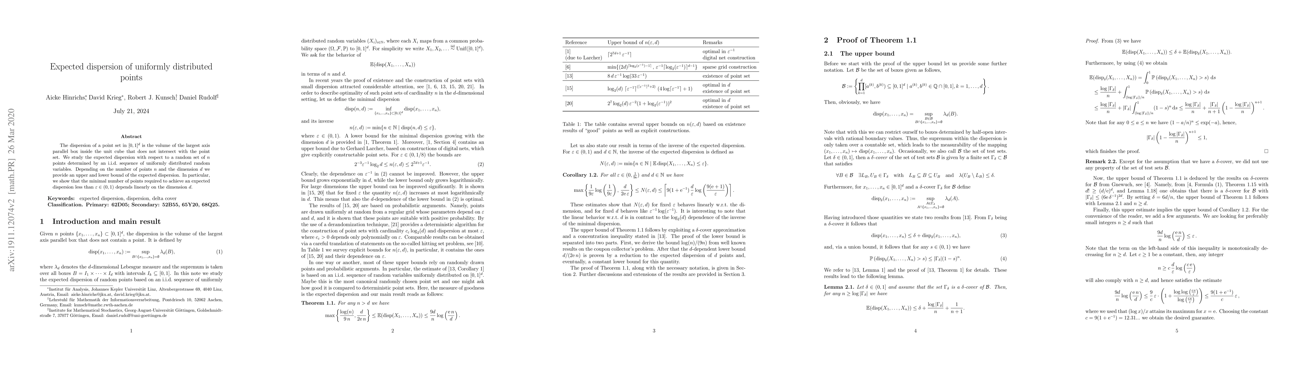The dispersion of a point set in $[0,1]^d$ is the volume of the largest axis parallel box inside the unit cube that does not intersect with the point set. We study the expected dispersion with respect to a random set of $n$ points determined by an i.i.d. sequence of uniformly distributed random variables. Depending on the number of points $n$ and the dimension $d$ we provide an upper and lower bound of the expected dispersion. In particular, we show that the minimal number of points required to achieve an expected dispersion less than $\varepsilon\in(0,1)$ depends linearly on the dimension $d$.