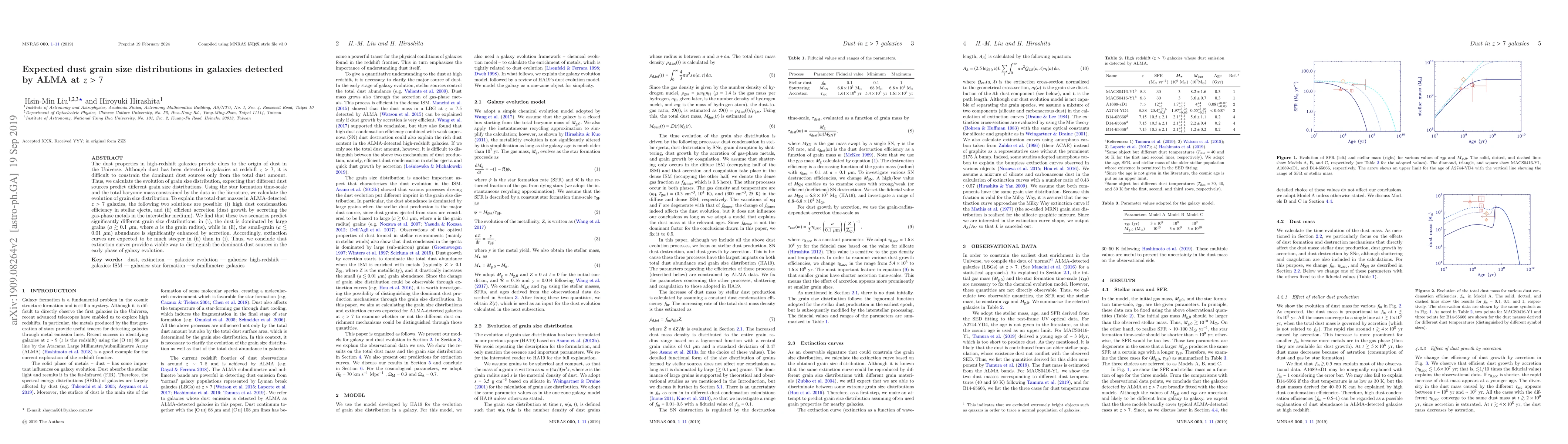 This paper investigates the dust grain size distributions in high-redshift galaxies detected by ALMA at $z>7$, proposing two possible scenarios for dust formation: high dust condensation efficiency in stellar ejecta and efficient accretion. The study suggests that these scenarios predict significantly different grain size distributions, which can be used to distinguish the dominant dust sources in early galaxy evolution.