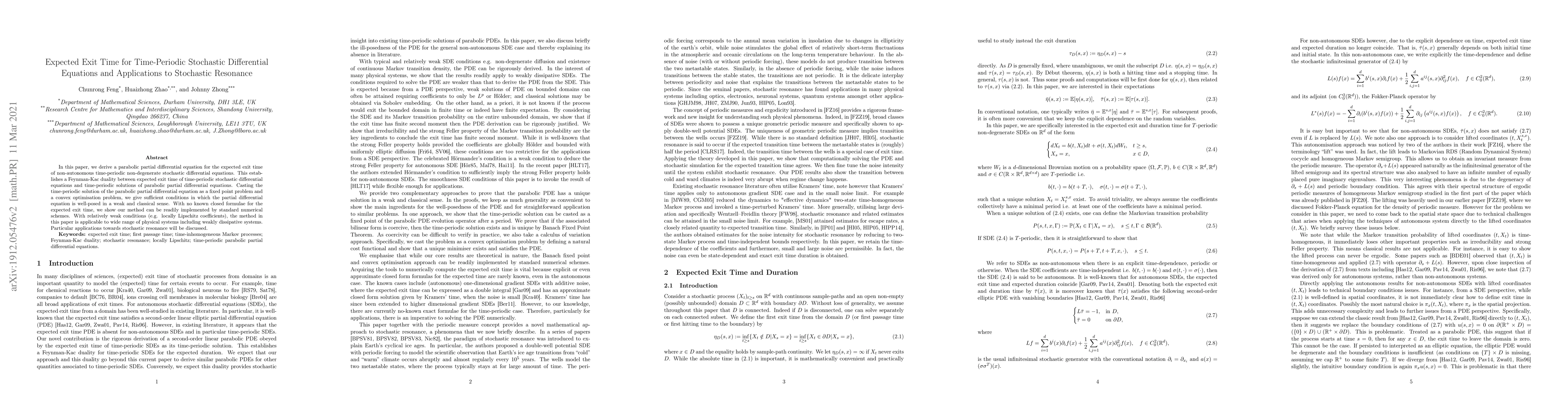 This paper derives a parabolic PDE for the expected exit time of time-periodic stochastic differential equations, establishing a Feynman-Kac duality. It provides a numerical method for solving this PDE and discusses its application to stochastic resonance, applicable to a wide range of physical systems.
