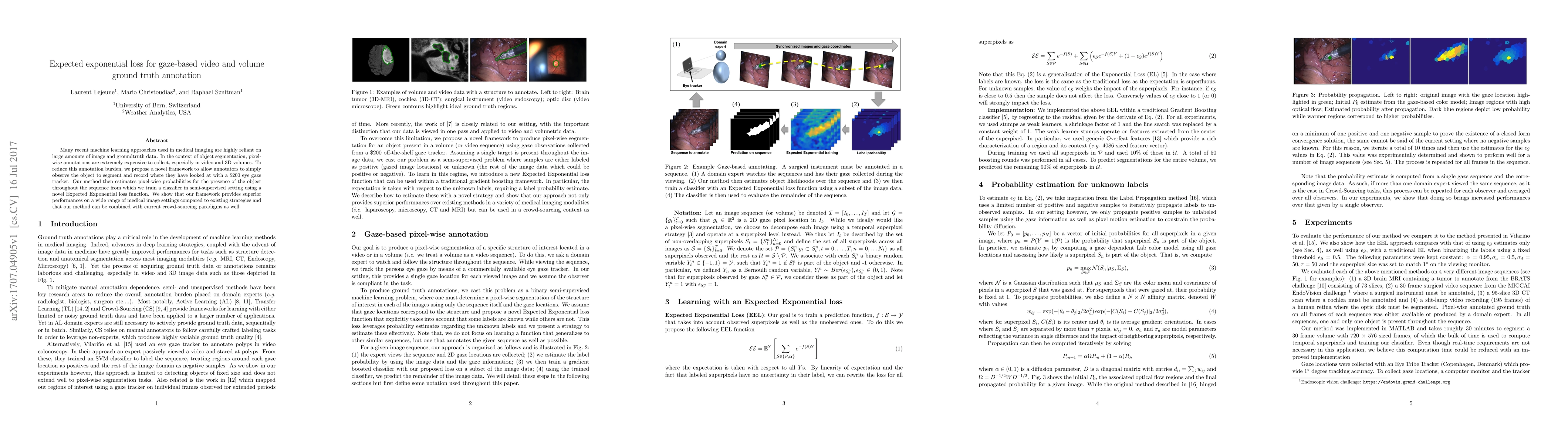 Many recent machine learning approaches used in medical imaging are highly reliant on large amounts of image and ground truth data. In the context of object segmentation, pixel-wise annotations are extremely expensive to collect, especially in video and 3D volumes. To reduce this annotation burden, we propose a novel framework to allow annotators to simply observe the object to segment and record where they have looked at with a \$200 eye gaze tracker. Our method then estimates pixel-wise probabilities for the presence of the object throughout the sequence from which we train a classifier in semi-supervised setting using a novel Expected Exponential loss function. We show that our framework provides superior performances on a wide range of medical image settings compared to existing strategies and that our method can be combined with current crowd-sourcing paradigms as well.