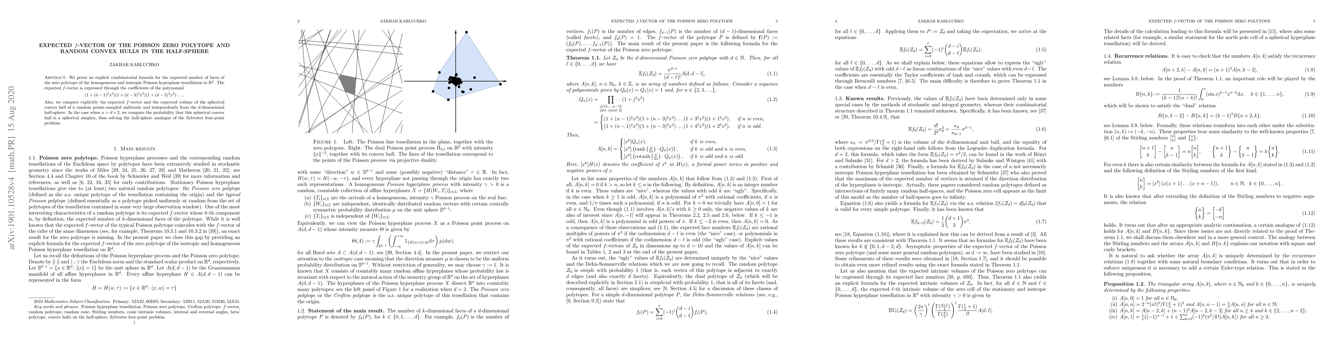 We prove an explicit combinatorial formula for the expected number of faces of the zero polytope of the homogeneous and isotropic Poisson hyperplane tessellation in $\mathbb R^d$. The expected $f$-vector is expressed through the coefficients of the polynomial $$ (1+ (d-1)^2x^2) (1+(d-3)^2 x^2) (1+(d-5)^2 x^2) \ldots. $$ Also, we compute explicitly the expected $f$-vector and the expected volume of the spherical convex hull of $n$ random points sampled uniformly and independently from the $d$-dimensional half-sphere. In the case when $n=d+2$, we compute the probability that this spherical convex hull is a spherical simplex, thus solving an analogue of the Sylvester four-point problem on the half-sphere.