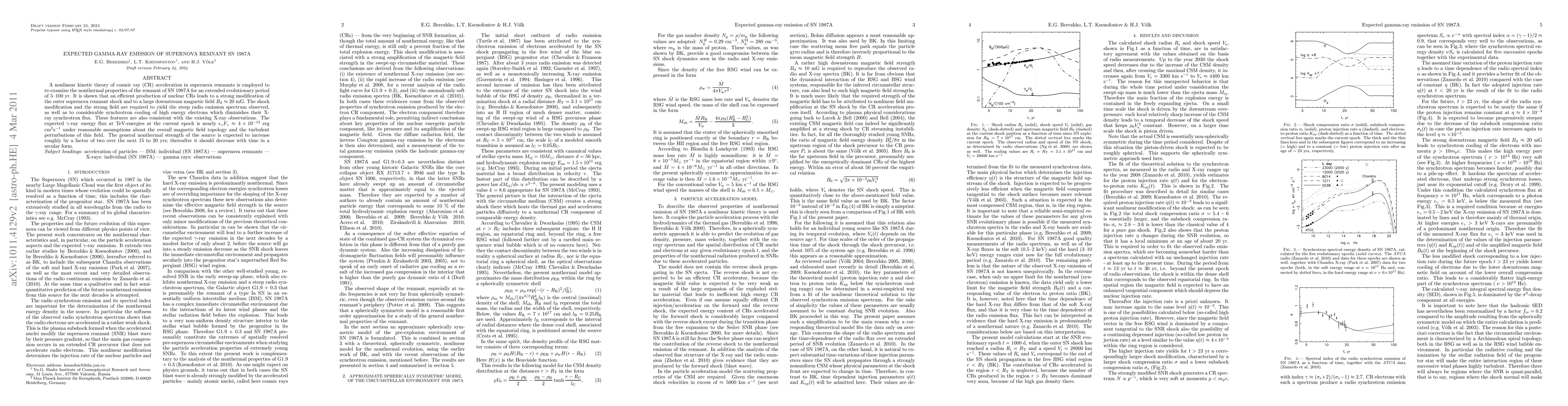 This paper uses a nonlinear kinetic theory to analyze the evolution of SN 1987A's supernova remnant, predicting a strong gamma-ray emission at TeV energies due to accelerated cosmic rays and a modified shock front. The expected gamma-ray flux is approximately $4\times 10^{-13}$ erg cm$^{-2}$s$^{-1}$ currently, with the source's nonthermal strength expected to double in the next 15-20 years before gradually declining.