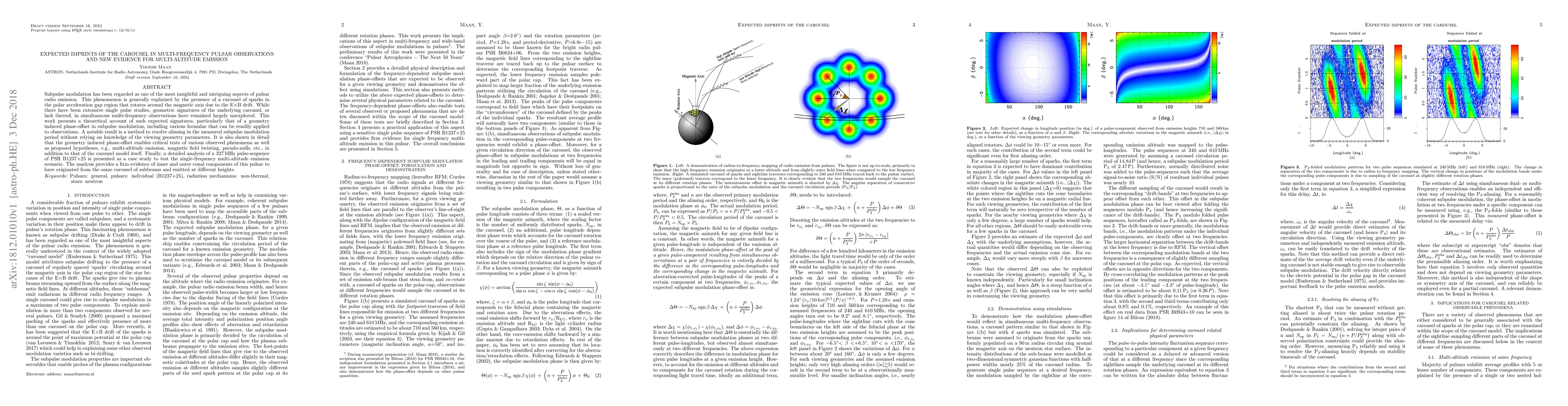Subpulse modulation has been regarded as one of the most insightful and intriguing aspects of pulsar radio emission. This phenomenon is generally explained by the presence of a carousel of sparks in the polar acceleration gap region that rotates around the magnetic axis due to the E$\times$B drift. While there have been extensive single pulse studies, geometric signatures of the underlying carousel, or lack thereof, in simultaneous multi-frequency observations have remained largely unexplored. This work presents a theoretical account of such expected signatures, particularly that of a geometry induced phase-offset in subpulse modulation, including various formulae that can be readily applied to observations. A notable result is a method to resolve aliasing in the measured subpulse modulation period without relying on knowledge of the viewing geometry parameters. It is also shown in detail that the geometry induced phase-offset enables critical tests of various observed phenomena as well as proposed hypotheses, e.g., multi-altitude emission, magnetic field twisting, pseudo-nulls, etc., in addition to that of the carousel model itself. Finally, a detailed analysis of a 327 MHz pulse-sequence of PSR B1237+25 is presented as a case study to test the single-frequency multi-altitude emission scenario. The analysis provides a firm evidence of inner and outer conal components of this pulsar to have originated from the same carousel of subbeams and emitted at different heights.