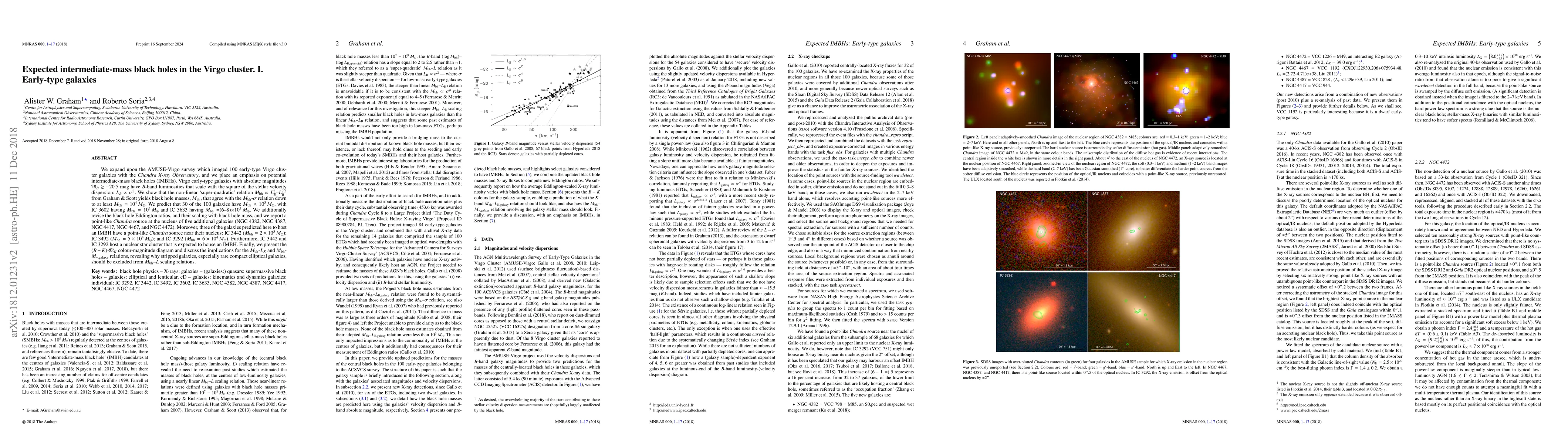 We expand upon the AMUSE-Virgo survey which imaged 100 early-type Virgo cluster galaxies with the Chandra X-ray Observatory, and we place an emphasis on potential intermediate mass black holes (IMBHs). Virgo early-type galaxies with absolute magnitudes $\mathfrak{M}_B\gtrsim-20.5$ mag have $B$-band luminosities that scale with the square of the stellar velocity dispersion: $L_B\propto\sigma^2$. We show that the non-linear `super-quadratic' relation $M_{\rm bh}\propto L_B^2$-$L_B^{2.5}$ from Graham & Scott yields black hole masses, $M_{\rm bh}$, that agree with the $M_{\rm bh}$-$\sigma$ relation down to at least $M_{\rm bh}=10^4\,M_{\odot}$. We predict that 30 of the 100 galaxies have $M_{\rm bh}\le10^5\,M_{\odot}$, with IC3602 having $M_{\rm bh}=10^4\,M_{\odot}$ and IC3633 having $M_{\rm bh}=$(6-8)$\times10^3\,M_{\odot}$. We additionally revise the black hole Eddington ratios and their scaling with black hole mass, and report a point-like Chandra source at the nucleus of five additional galaxies (NGC4382, NGC4387, NGC4417, NGC4467, and NGC4472). Moreover, three of the galaxies predicted here to host an IMBH have a point-like Chandra source near their nucleus: IC3442 ($M_{\rm bh}=2\times10^5\,M_{\odot}$); IC3492 ($M_{\rm bh}=5\times10^4\,M_{\odot}$); and IC3292 ($M_{\rm bh}=6\times10^4\,M_{\odot}$). Furthermore, IC3442 and IC3292 host a nuclear star cluster that is expected to house an IMBH. Finally, we present the ($B-K$)-$\mathfrak{M}_K$ colour-magnitude diagram and discuss the implications for the $M_{\rm bh}$-$L_K$ and $M_{\rm bh}$-$M_{\rm *,galaxy}$ relations, revealing why stripped galaxies, especially rare compact elliptical galaxies, should be excluded from $M_{\rm bh}$-$L$ and $M_{\rm bh}$-$M_{\rm *,galaxy}$ scaling relations.