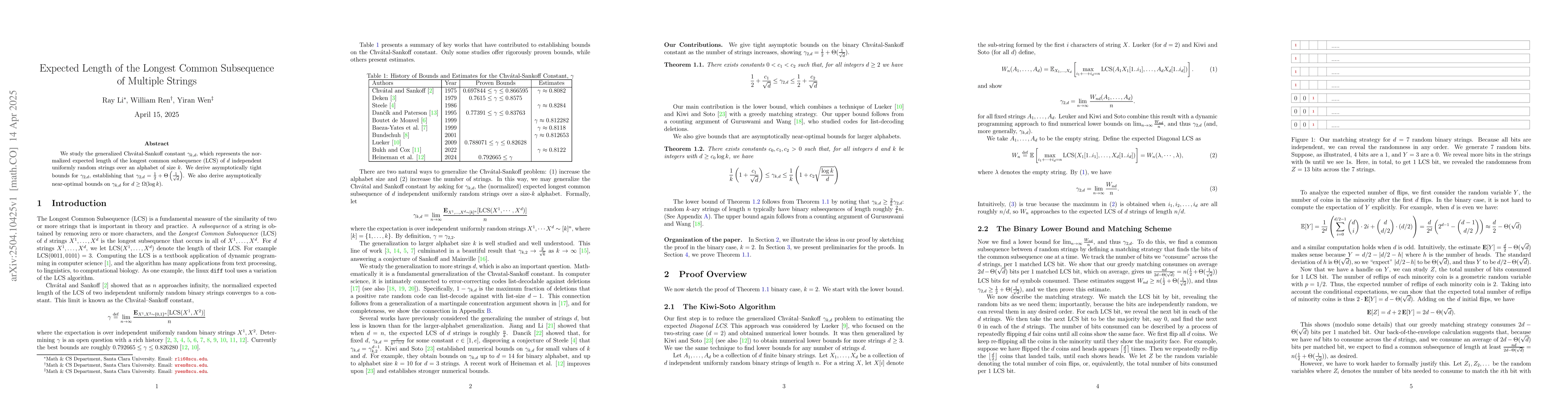 The paper studies the expected length of the longest common subsequence (LCS) of multiple random strings, establishing bounds for the normalized expected length η_{2,d} and near-optimal bounds on η_{k,d}.