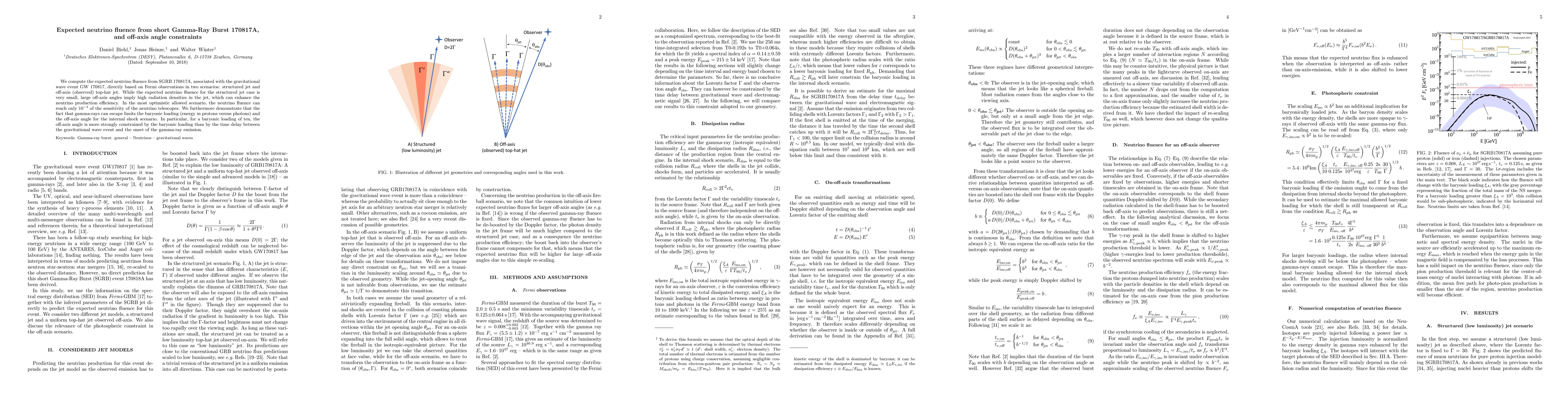 We compute the expected neutrino fluence from SGRB 170817A, associated with the gravitational wave event GW 170817, directly based on Fermi observations in two scenarios: structured jet and off-axis (observed) top-hat jet. While the expected neutrino fluence for the structured jet case is very small, large off-axis angles imply high radiation densities in the jet, which can enhance the neutrino production efficiency. In the most optimistic allowed scenario, the neutrino fluence can reach only $10^{-4}$ of the sensitivity of the neutrino telescopes. We furthermore demonstrate that the fact that gamma-rays can escape limits the baryonic loading (energy in protons versus photons) and the off-axis angle for the internal shock scenario. In particular, for a baryonic loading of ten, the off-axis angle is more strongly constrained by the baryonic loading than by the time delay between the gravitational wave event and the onset of the gamma-ray emission.