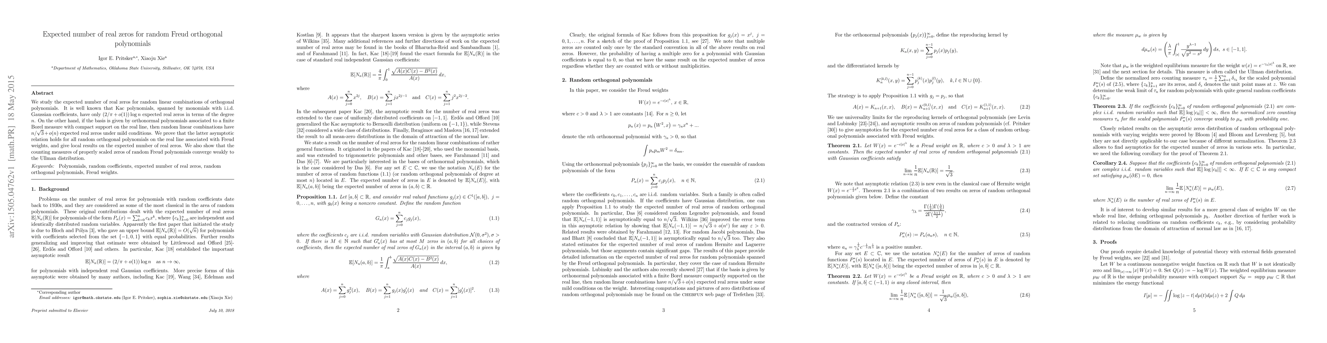 We study the expected number of real zeros for random linear combinations of orthogonal polynomials. It is well known that Kac polynomials, spanned by monomials with i.i.d. Gaussian coefficients, have only $(2/\pi + o(1))\log{n}$ expected real zeros in terms of the degree $n$. On the other hand, if the basis is given by orthonormal polynomials associated to a finite Borel measure with compact support on the real line, then random linear combinations have $n/\sqrt{3} + o(n)$ expected real zeros under mild conditions. We prove that the latter asymptotic relation holds for all random orthogonal polynomials on the real line associated with Freud weights, and give local results on the expected number of real zeros. We also show that the counting measures of properly scaled zeros of random Freud polynomials converge weakly to the Ullman distribution.