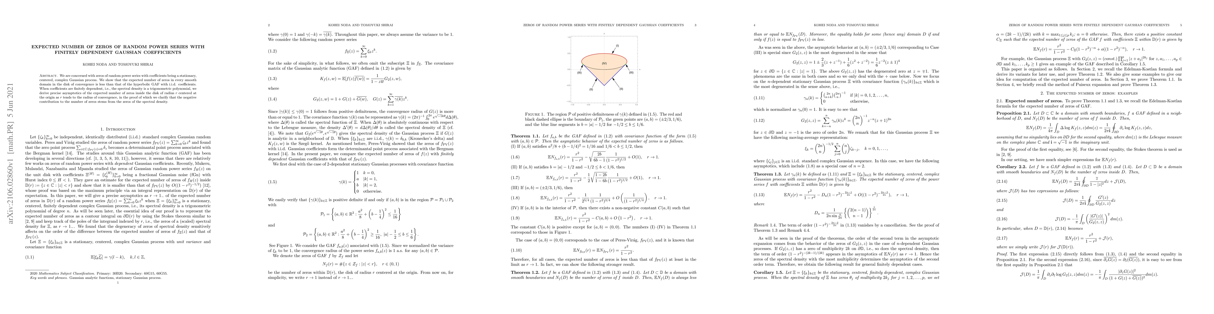 This paper investigates the expected number of zeros for random power series with coefficients from a stationary Gaussian process. It finds that the expected zero count is lower than that of the hyperbolic GAF with independent coefficients, and provides precise asymptotics for finitely dependent coefficients, attributing the reduced zero count to the zeros of the spectral density.