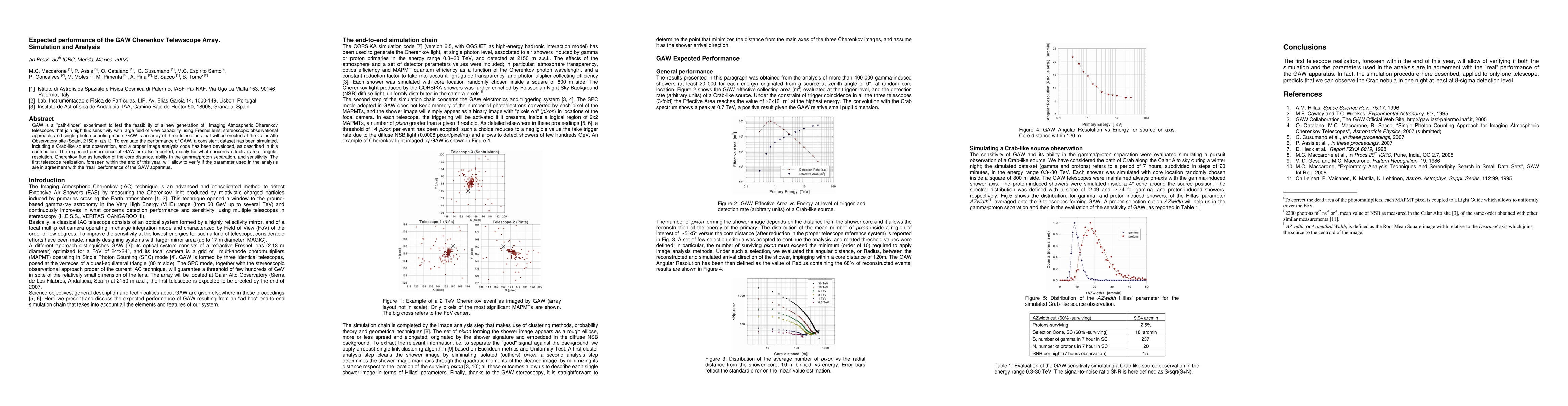 This paper evaluates the expected performance of the GAW Cherenkov Telescopes Array, simulating a Crab-like source observation and analyzing the results. The study highlights the array's effective area, angular resolution, and gamma/proton separation capabilities, aiming to verify these parameters against real-world performance.