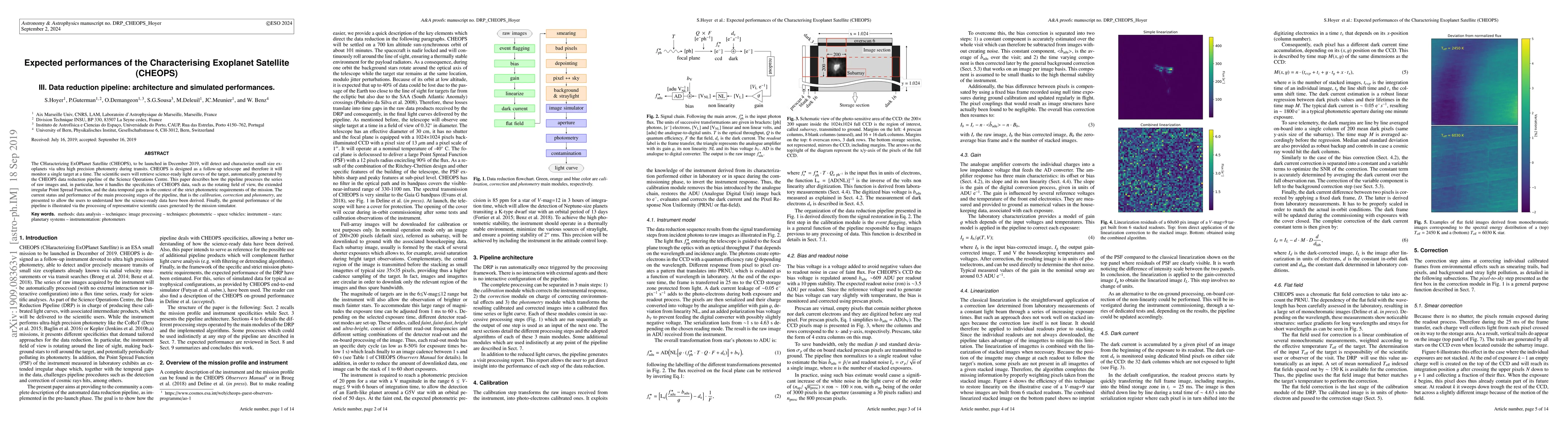 This paper details the architecture and simulated performance of the CHEOPS data reduction pipeline, which processes raw images to generate science-ready light curves for exoplanet characterization. It focuses on the pipeline's handling of CHEOPS-specific data challenges and presents the current status and performance of its main processing stages, including calibration, correction, and photometry.