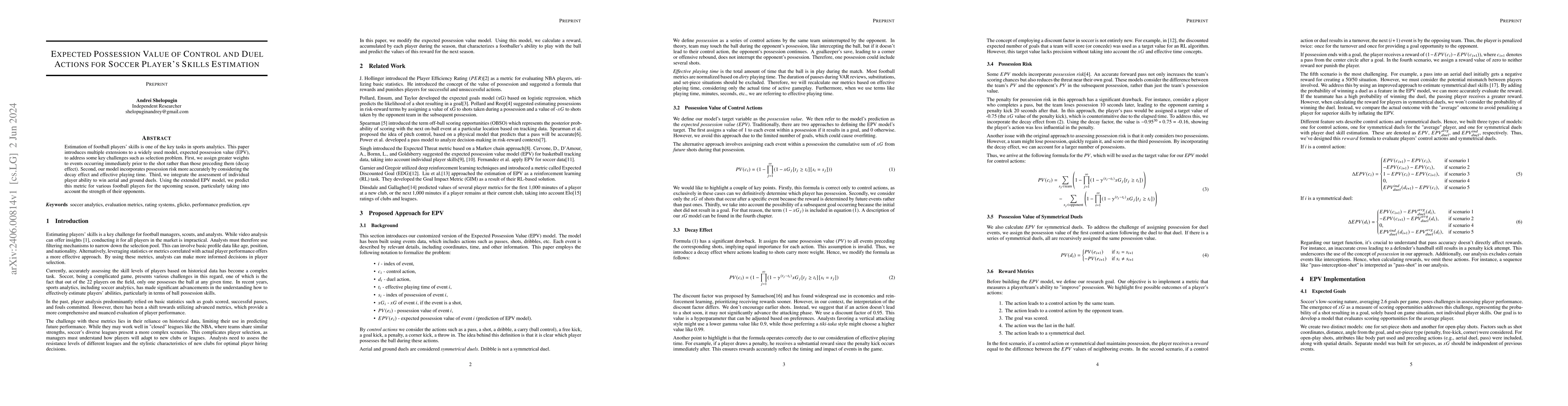 Estimation of football players' skills is one of the key tasks in sports analytics. This paper introduces multiple extensions to a widely used model, expected possession value (EPV), to address some key challenges such as selection problem. First, we assign greater weights to events occurring immediately prior to the shot rather than those preceding them (decay effect). Second, our model incorporates possession risk more accurately by considering the decay effect and effective playing time. Third, we integrate the assessment of individual player ability to win aerial and ground duels. Using the extended EPV model, we predict this metric for various football players for the upcoming season, particularly taking into account the strength of their opponents.