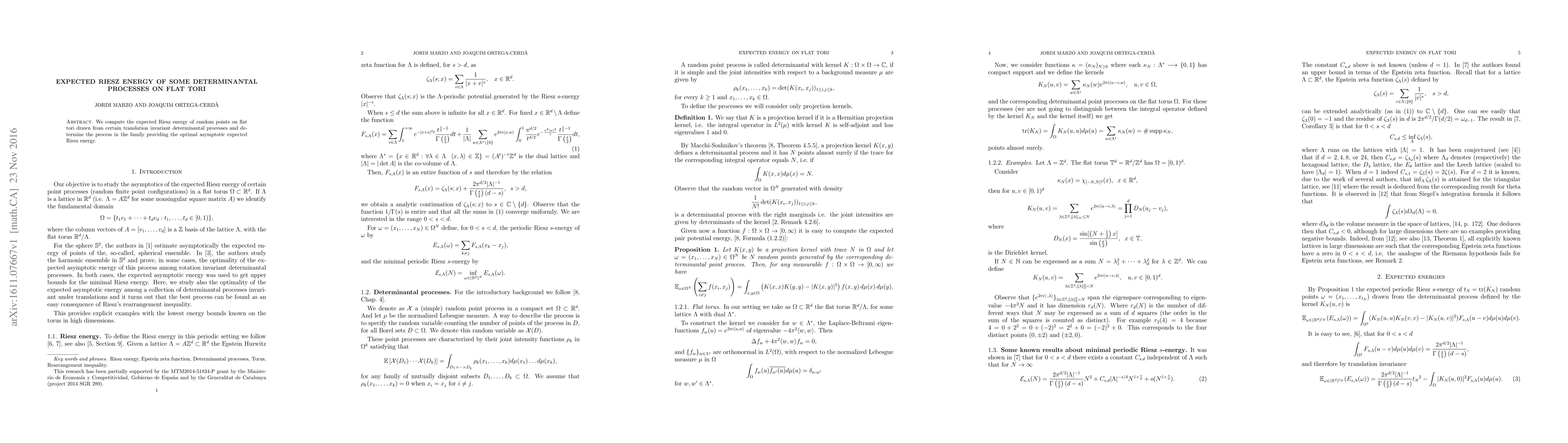 Summary: This paper calculates the expected Riesz energy for random points on flat tori from specific translation invariant determinantal processes and identifies the process that yields the best asymptotic expected Riesz energy.