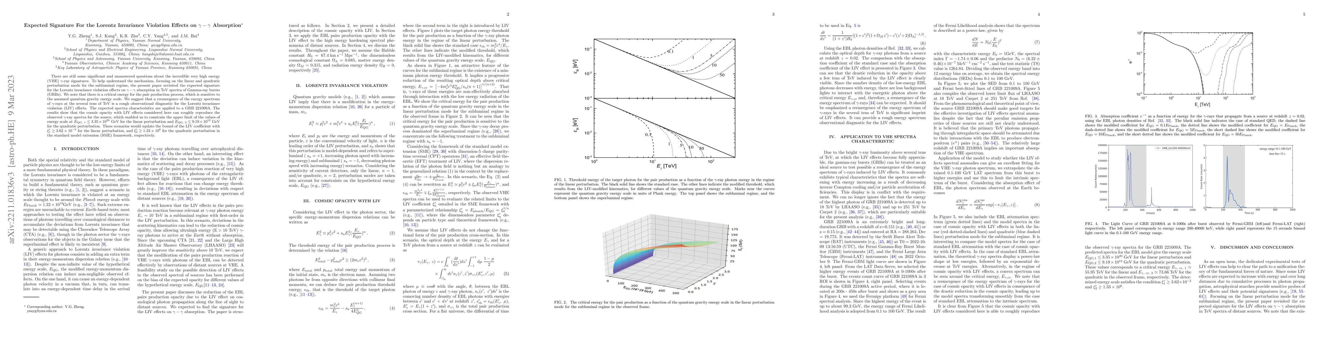 There are still some {significant and} unanswered questions about the {incredible} {very high energy (VHE)} $\gamma$-ray signatures. To help understand the mechanism, focusing on the linear and quadratic perturbation mode for the subluminal regime, the present paper revisited the expected signature for the Lorentz invariance violation effects on $\gamma-\gamma$ absorption in TeV spectra of Gamma-ray bursts (GRBs). We note that there is {a critical energy} for the pair production process, which is sensitive to the assumed quantum gravity energy scale. We suggest that a {reemergence of the energy spectrum of $\gamma$-rays} at the several tens of TeV is a rough observational diagnostic for the Lorentz invariance violation (LIV) effects. The expected spectra characteristics are applied to a GRB 221009A. The results show that the cosmic opacity with LIV effects considered here {can} roughly reproduce the observed $\gamma$-ray spectra for the source, which enabled us to constrain the upper limit of the values of energy scale at $E_{\rm QG,~1}\leq3.35\times10^{20}$ GeV for the linear perturbation and $E_{\rm QG,~2}\leq9.19\times10^{12}$ GeV for the quadratic perturbation. {These scenarios would update the bound of the LIV coefficient with $\xi_{\rm 1}^{\prime}\geq 3.62\times10^{-2}$ for the linear perturbation, and $\xi_{\rm 2}^{\prime}\geq 1.33\times10^{6}$ for the quadratic perturbation in the standard model extension (SME) framework, respectively. }